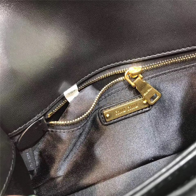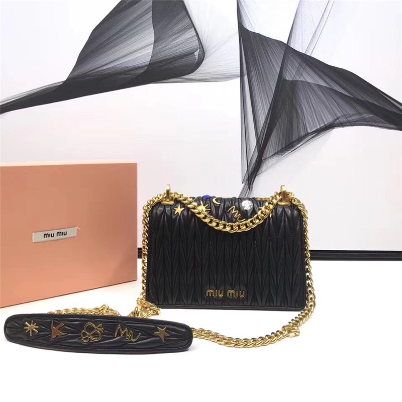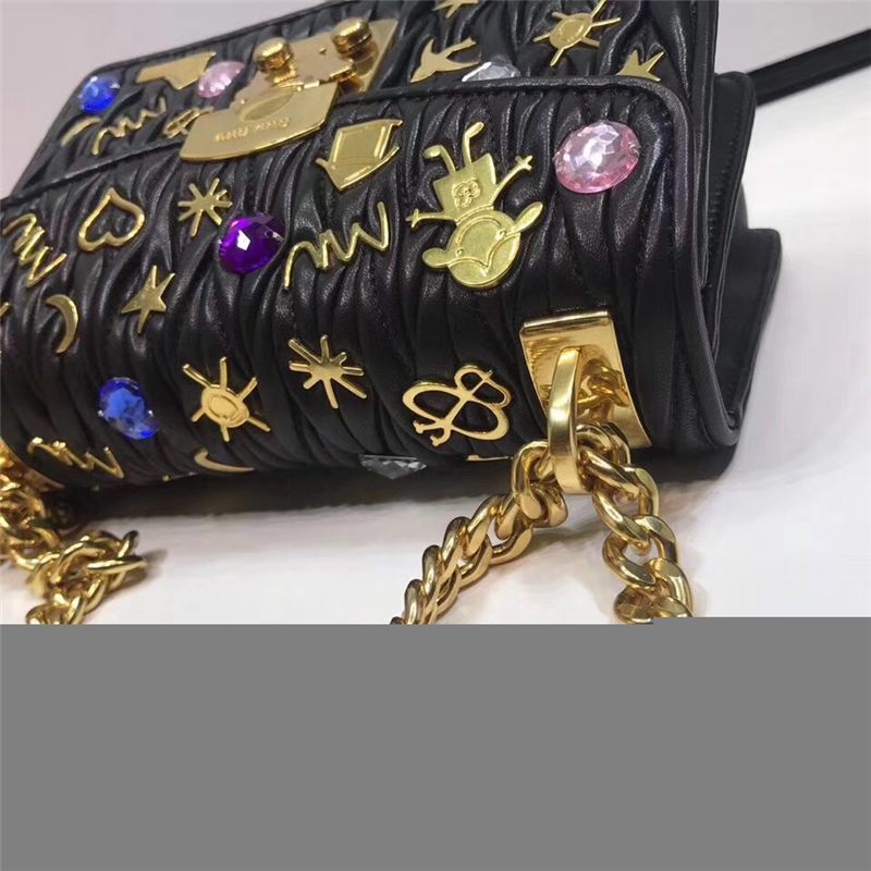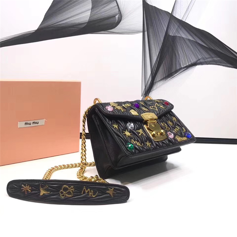 5BD081 MIUMIU专柜新款 褶皱小羊皮 贴花贴饰 按锁翻盖小方包 黑色