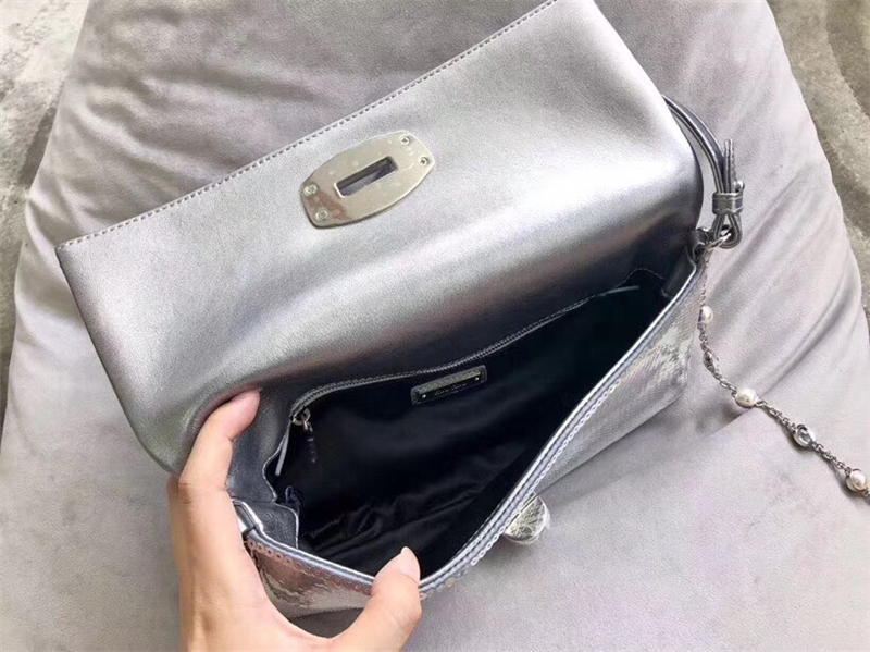 • 结构:棉缎衬里,翻盖和旋扣扣合,拉链内袋,可拆卸小羊皮肩带和仿水晶和人造珍珠链条长肩带