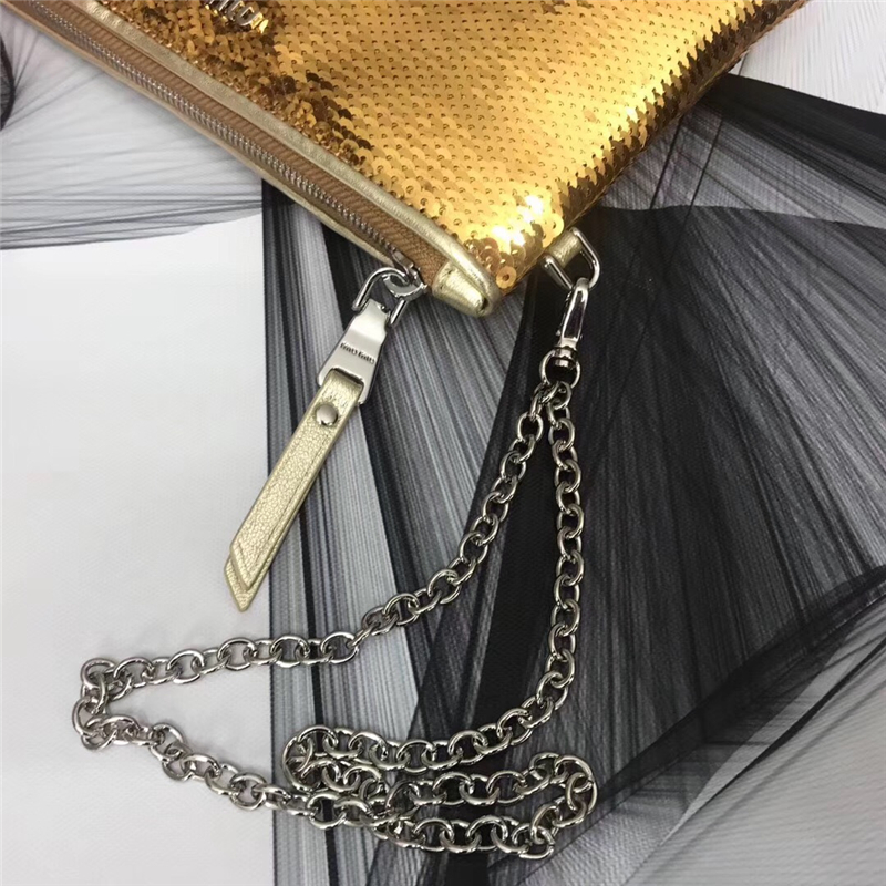 - 结构:绸缎衬里,拉链开合,金属链条肩带