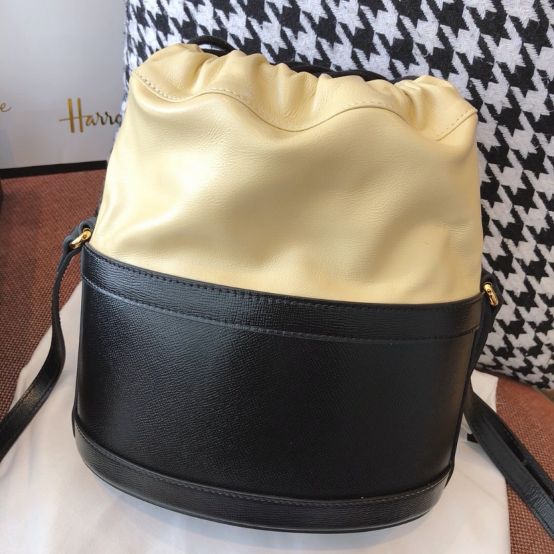 - 结构:黑色复古风格织纹皮革(底部)黄油色柔软皮革(顶部)金色调配件麂皮质感超细纤维衬里马衔扣细节可调节肩带(56厘米高)抽绳固定重量:约0.5千克