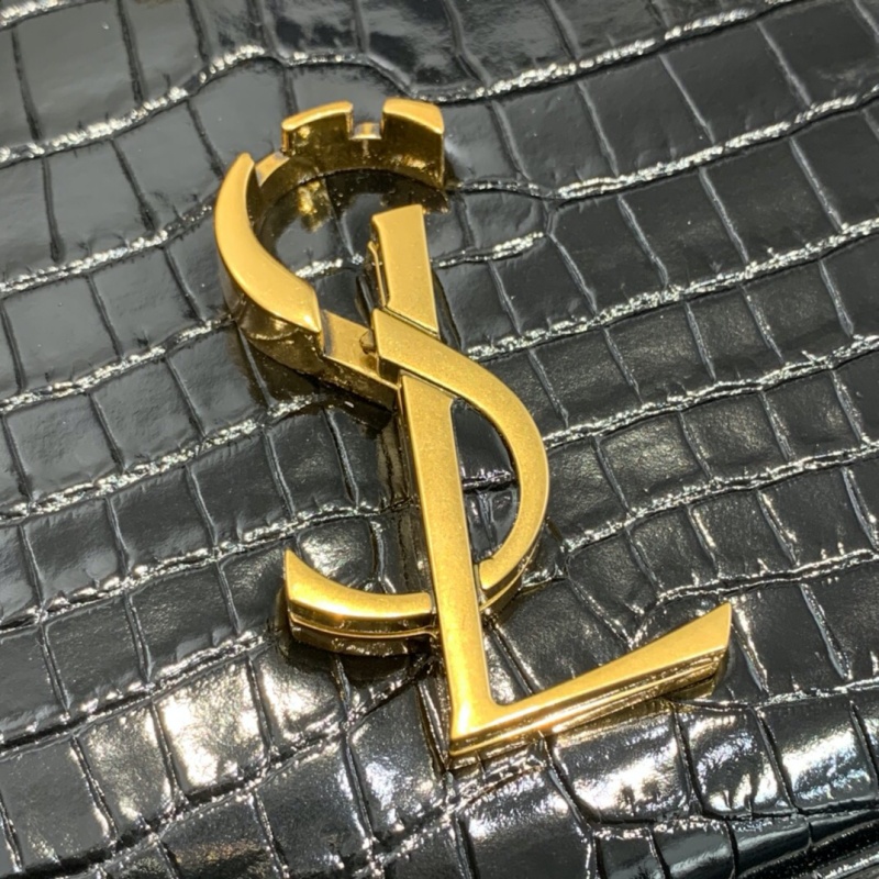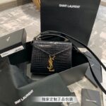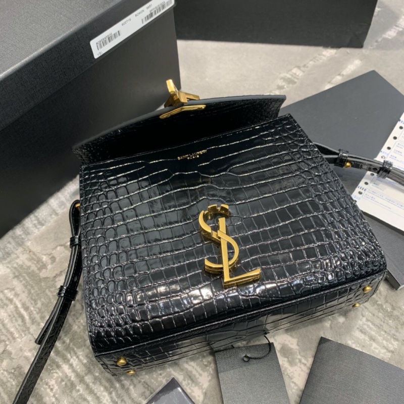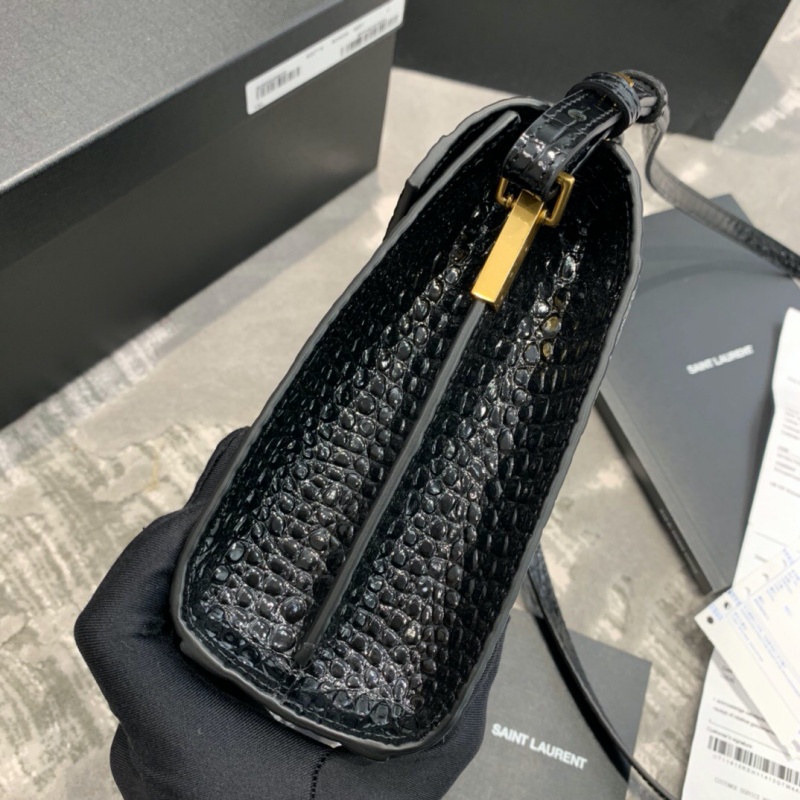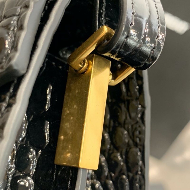 - 602716 YSL圣罗兰 CASSANDRA迷你鳄鱼纹压印亮面皮革手提包 黑色