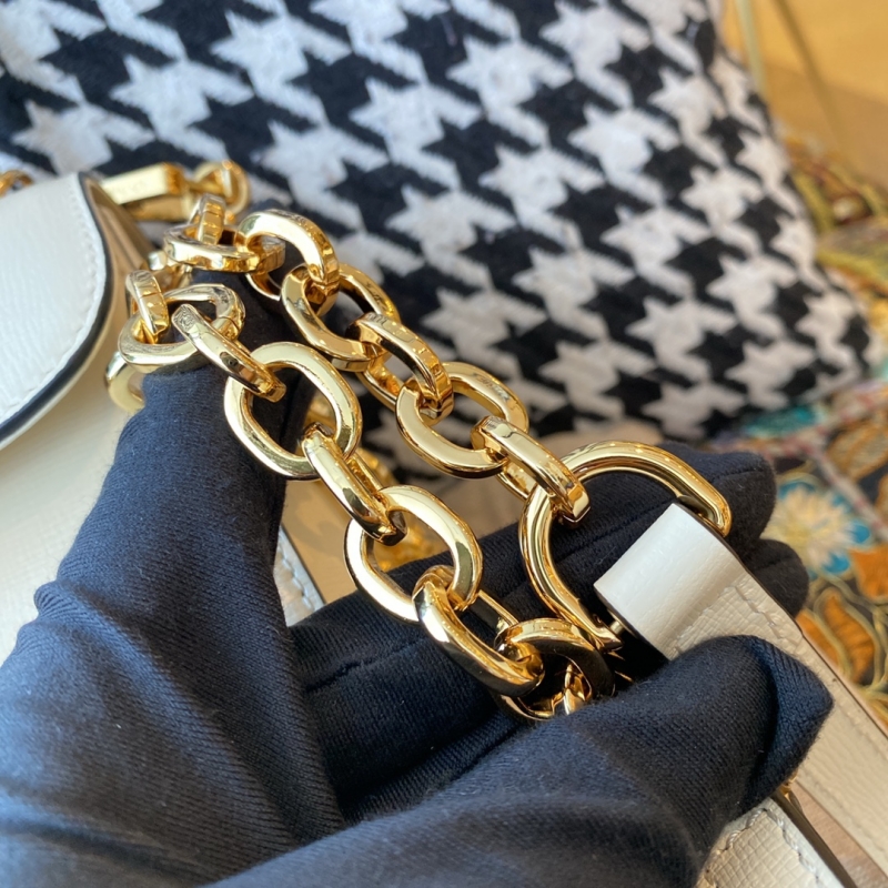 - 结构:白色皮革 金色调配件 马衔扣 内部:2个主隔层和1个开口口袋 提手(10厘米高) 50厘米链带和54厘米可拆卸皮革肩带 重量:约0.9千克