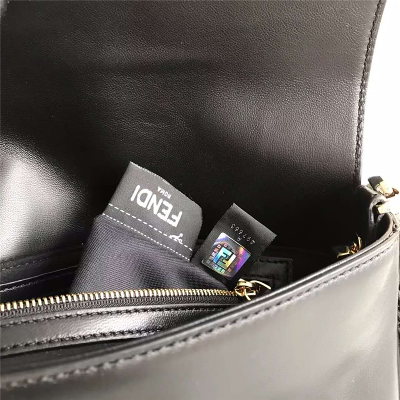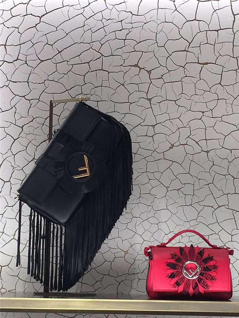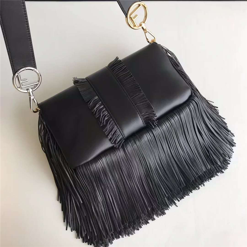 - 详细介绍:经典单肩背手袋,金属磁扣开合翻盖。内衬里设有一个拉链口袋。可拆卸肩带。黑色软皮制作,缀以同色系流苏。翻盖和可拆卸肩带饰以最新FENDI F LOGO。镀钯混搭金色饰面金属配饰。