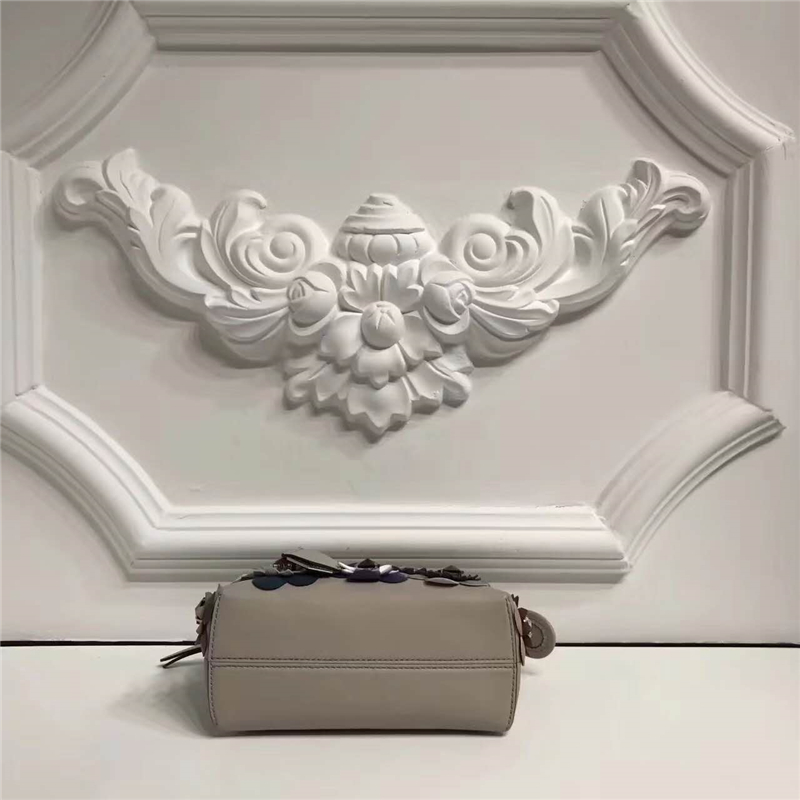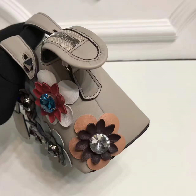- 详细介绍:FENDI 芬迪 波士顿花朵铆小牛皮手提包正面饰以同色系花朵铆钉装饰,增添一丝小淑女气息质感清洗,色泽均匀,耐磨耐用,金属饰钉的双提手和可拆卸肩带。顶部拉链和内袋。包型立体,非常灵动,时尚前卫,搭配立马减龄不少。