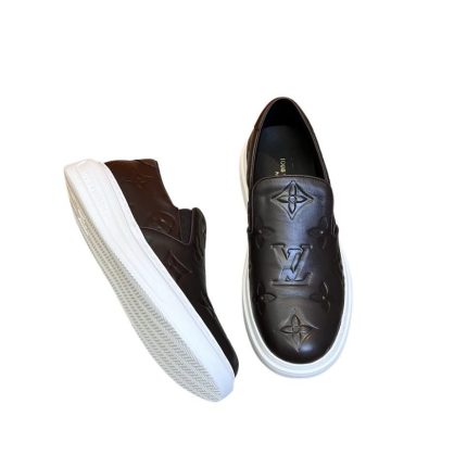 Beverly Hills 一脚蹬运动鞋采用柔软的粒面设计,压纹超大版本的标志性 Monogram 图案。该鞋款的特点是其厚实而轻盈的白色橡胶外底,上面刻有路易威登标志。谨慎的弹性嵌片让这款鞋款可以轻松穿脱。