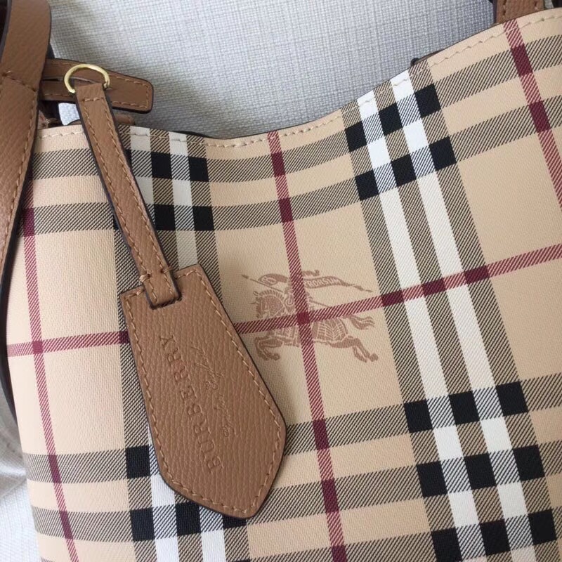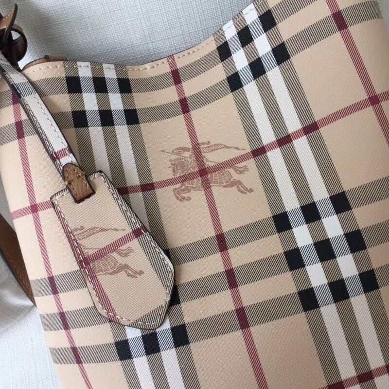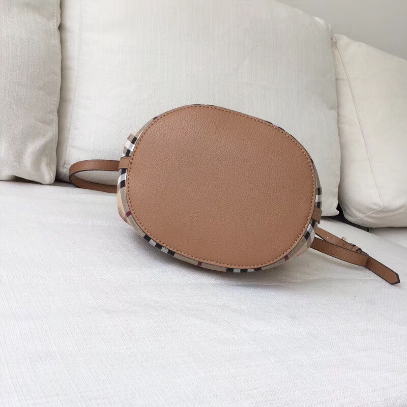 Burberry巴宝莉 Haymarket格纹 战马印花 拼色皮革 水桶包 浅棕