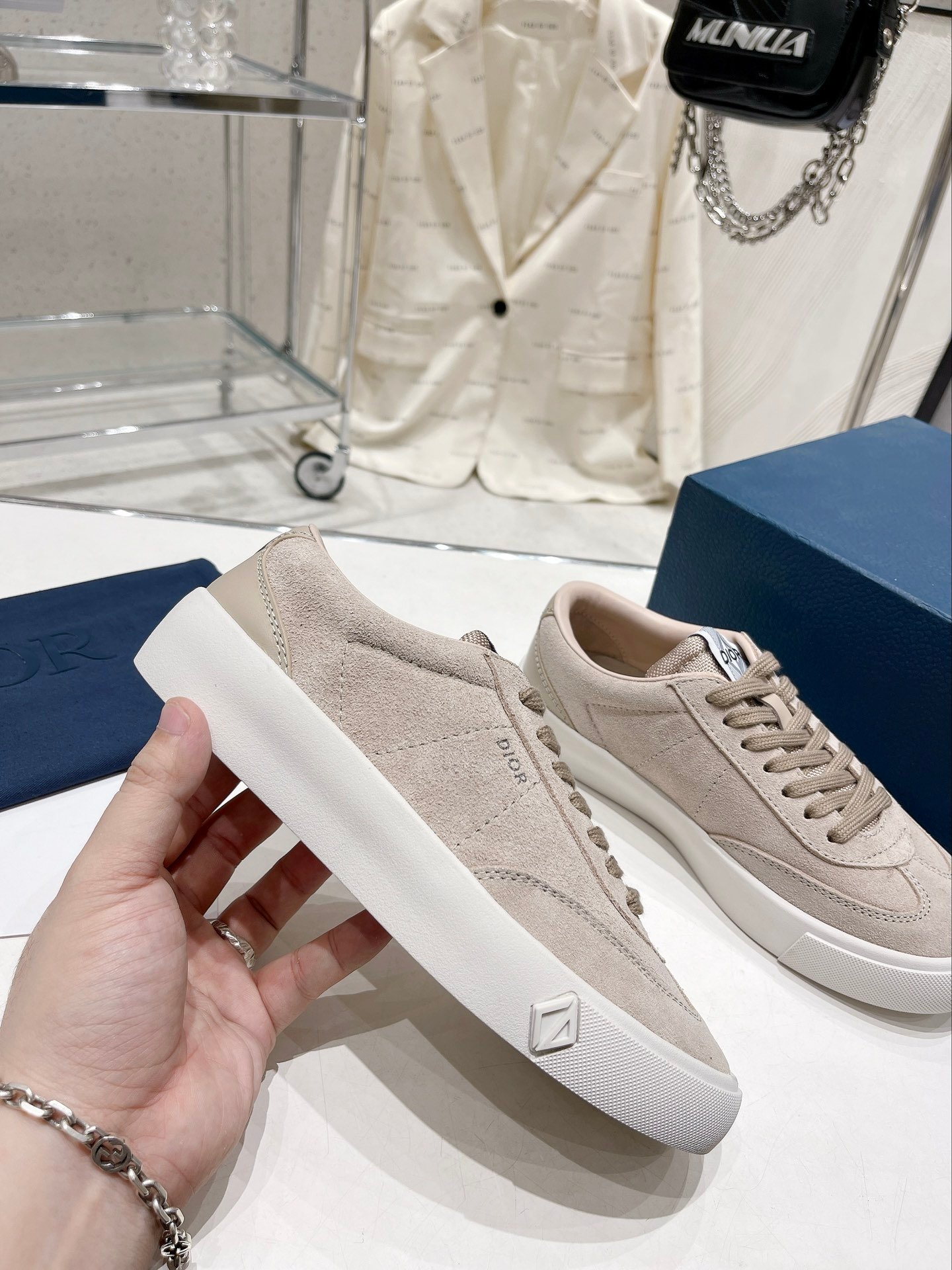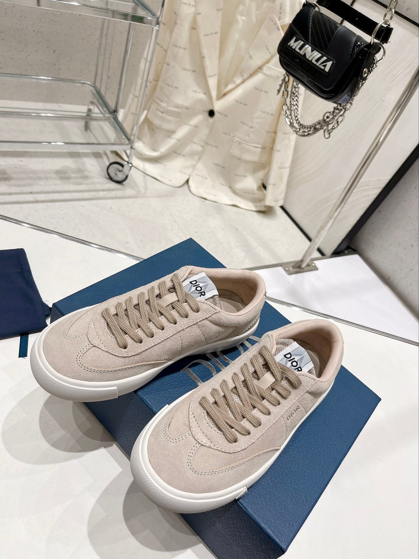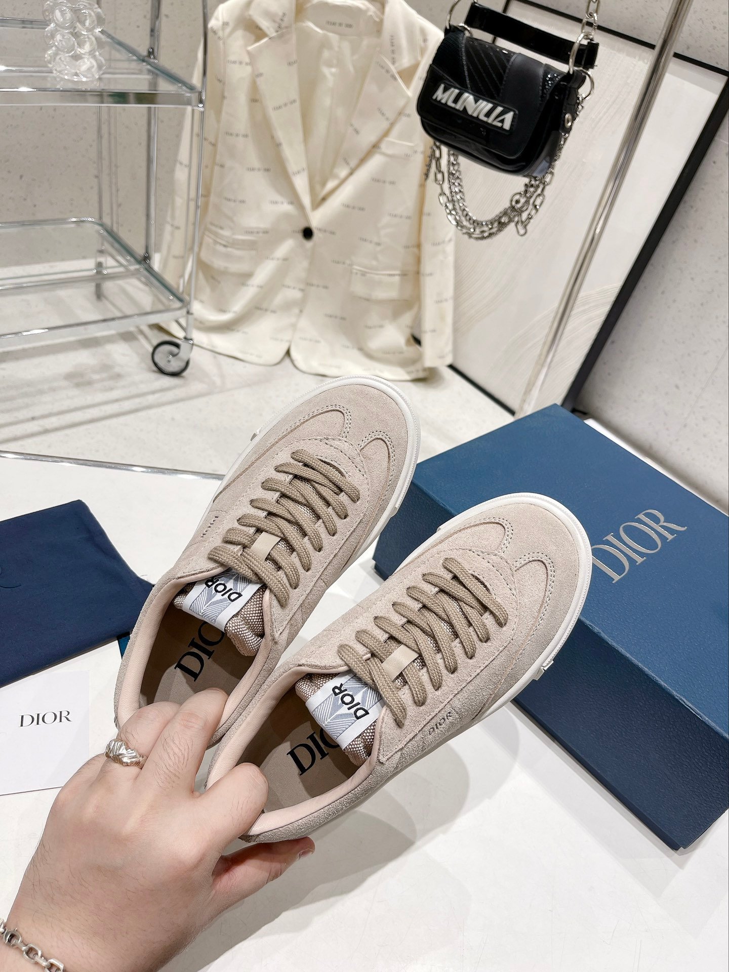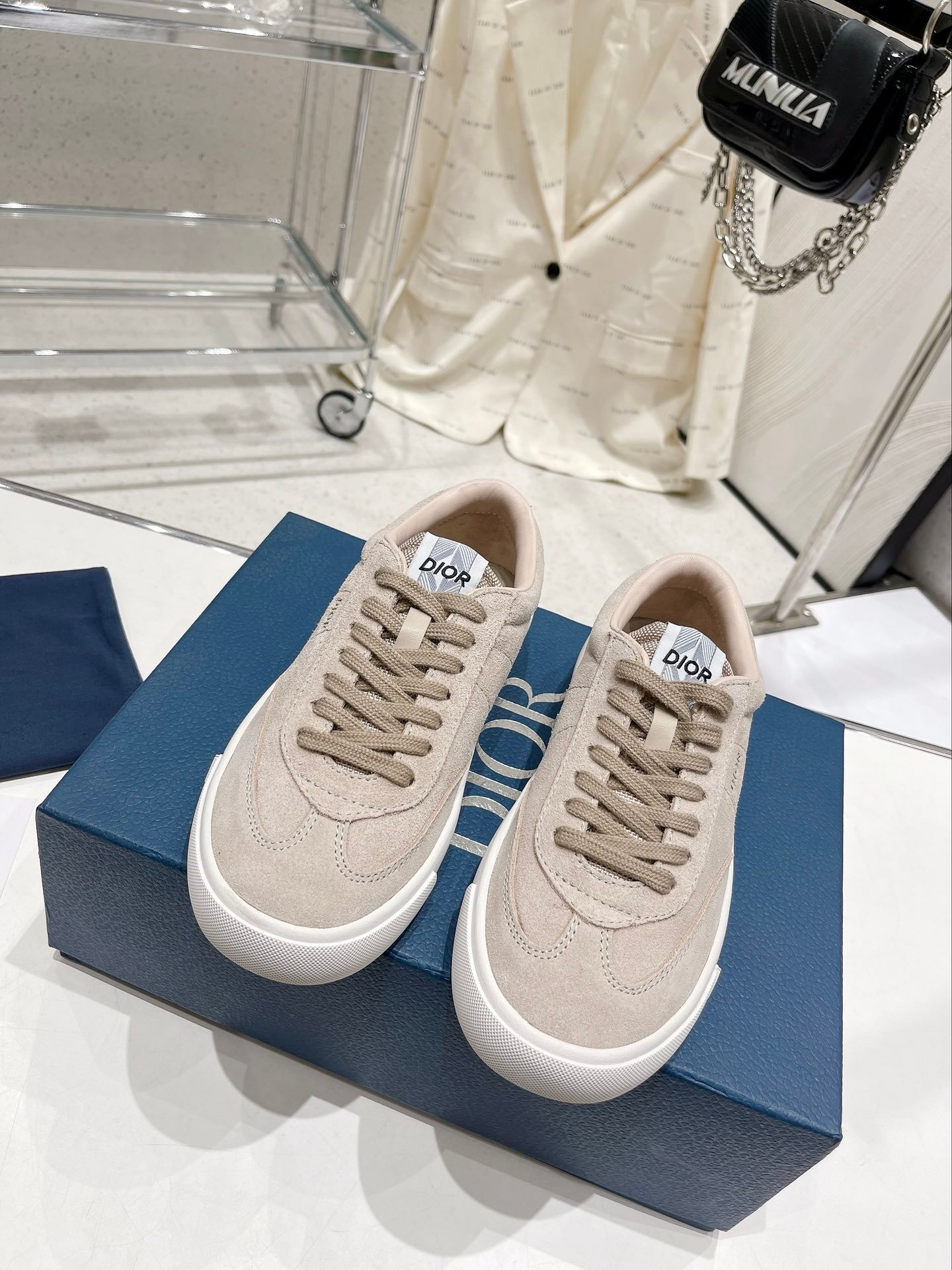CD B101 运动鞋作为本季衣橱新经典单品展示。带衬垫鞋舌,背面和侧面饰有 CD Diamond 和 DIOR 标志。配有成型的同色外底,非常适合搭配牛仔裤或西装裤,打造休闲