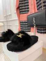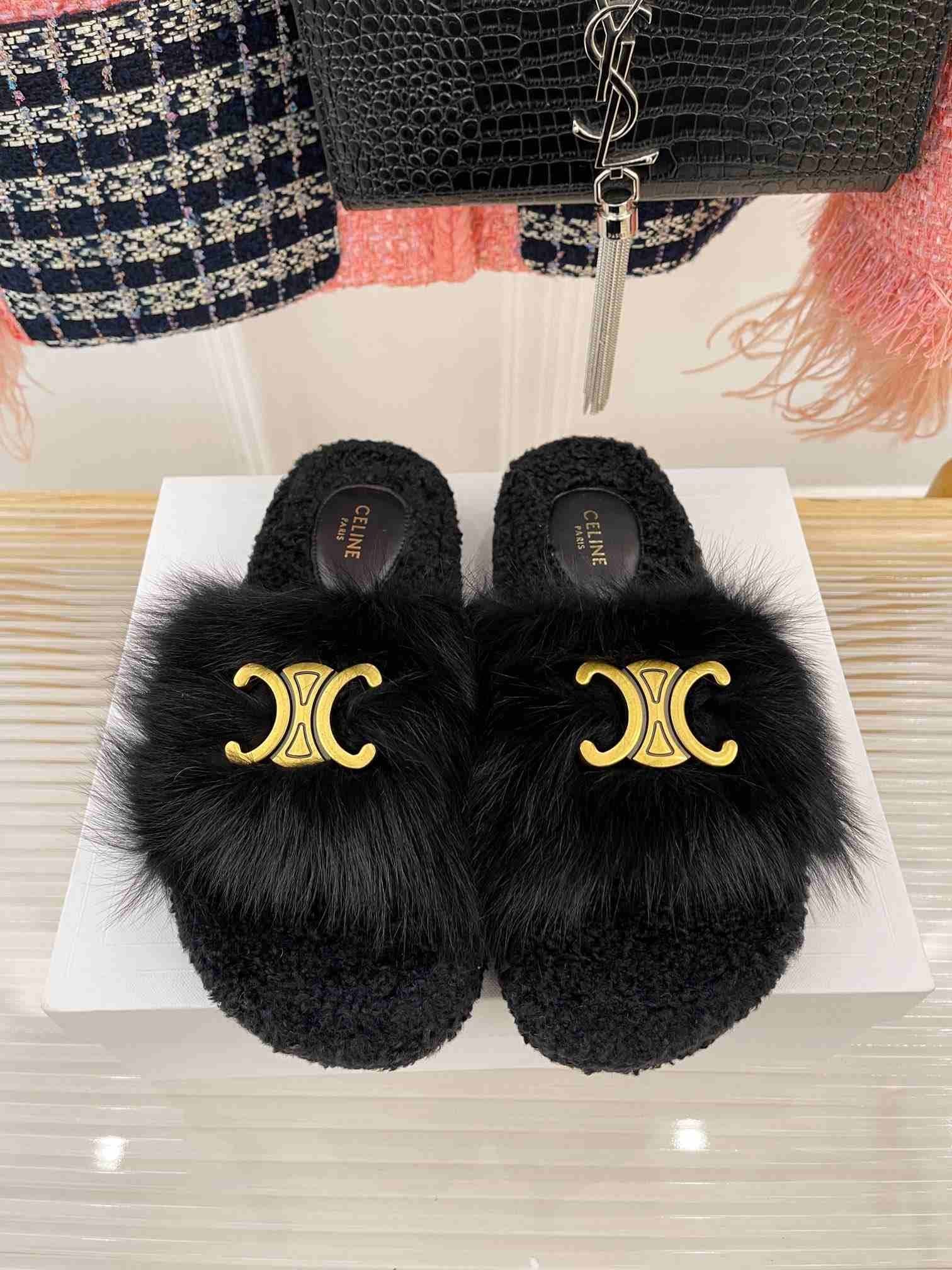 Celine Clea Triomphe 黑色毛皮拖鞋
