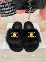 Celine Clea Triomphe 女式毛皮黑色拖鞋