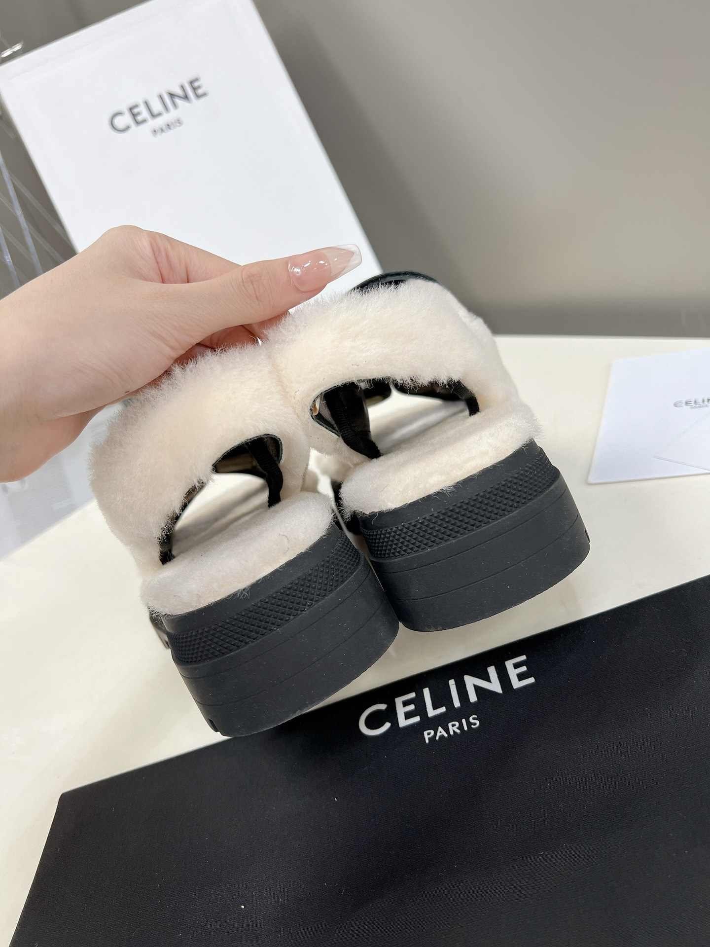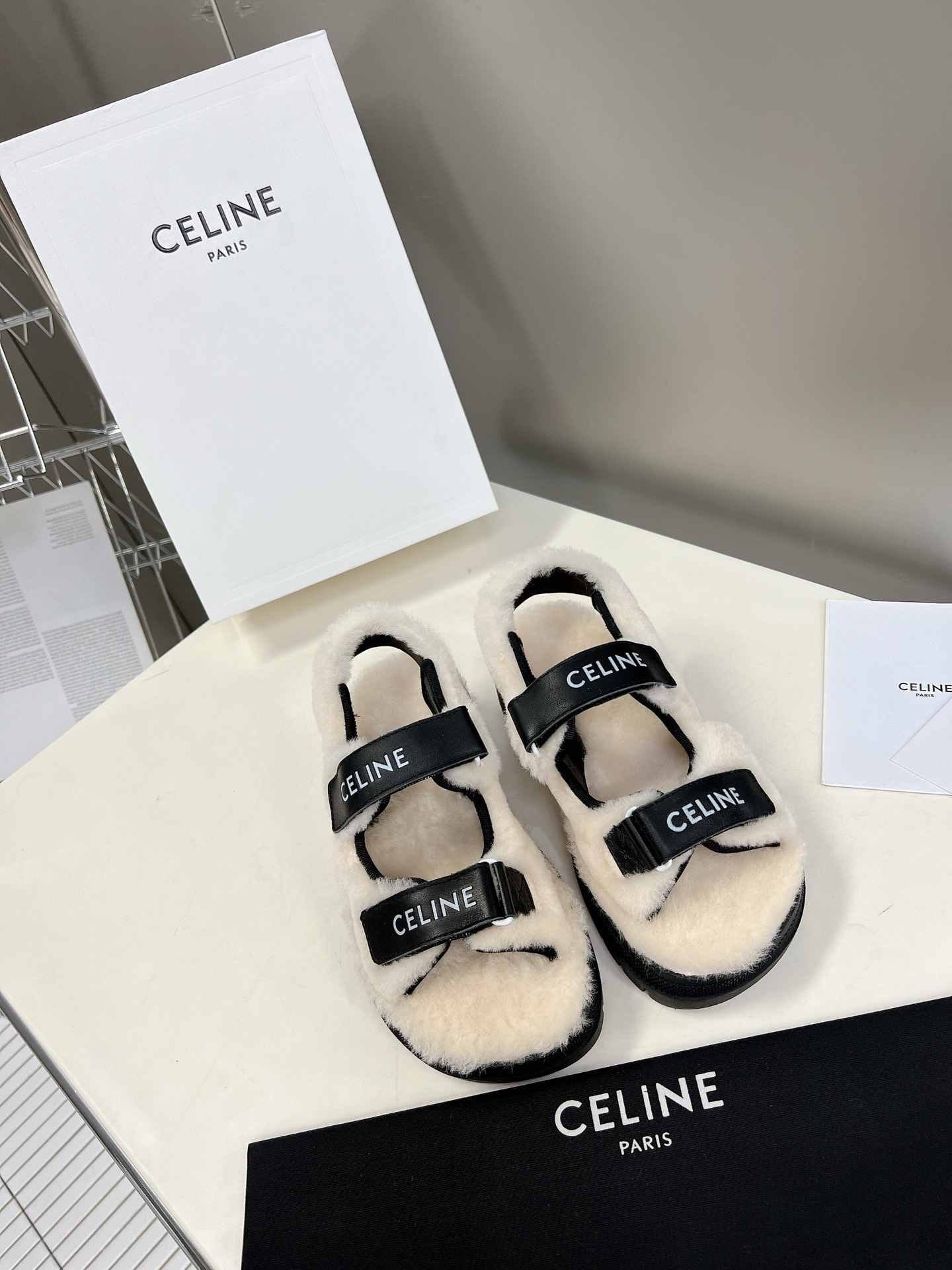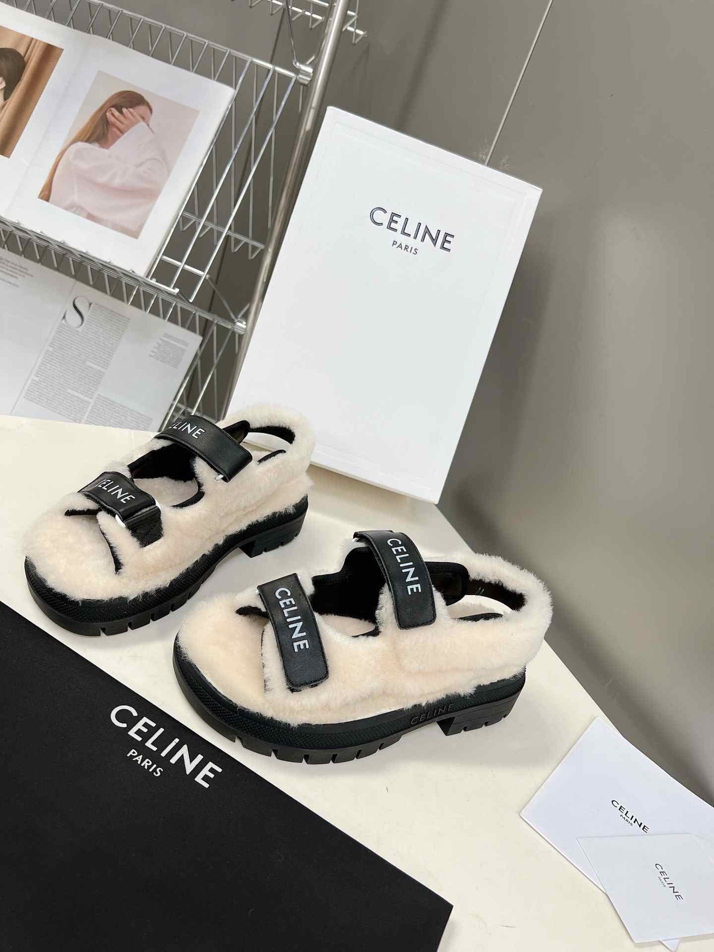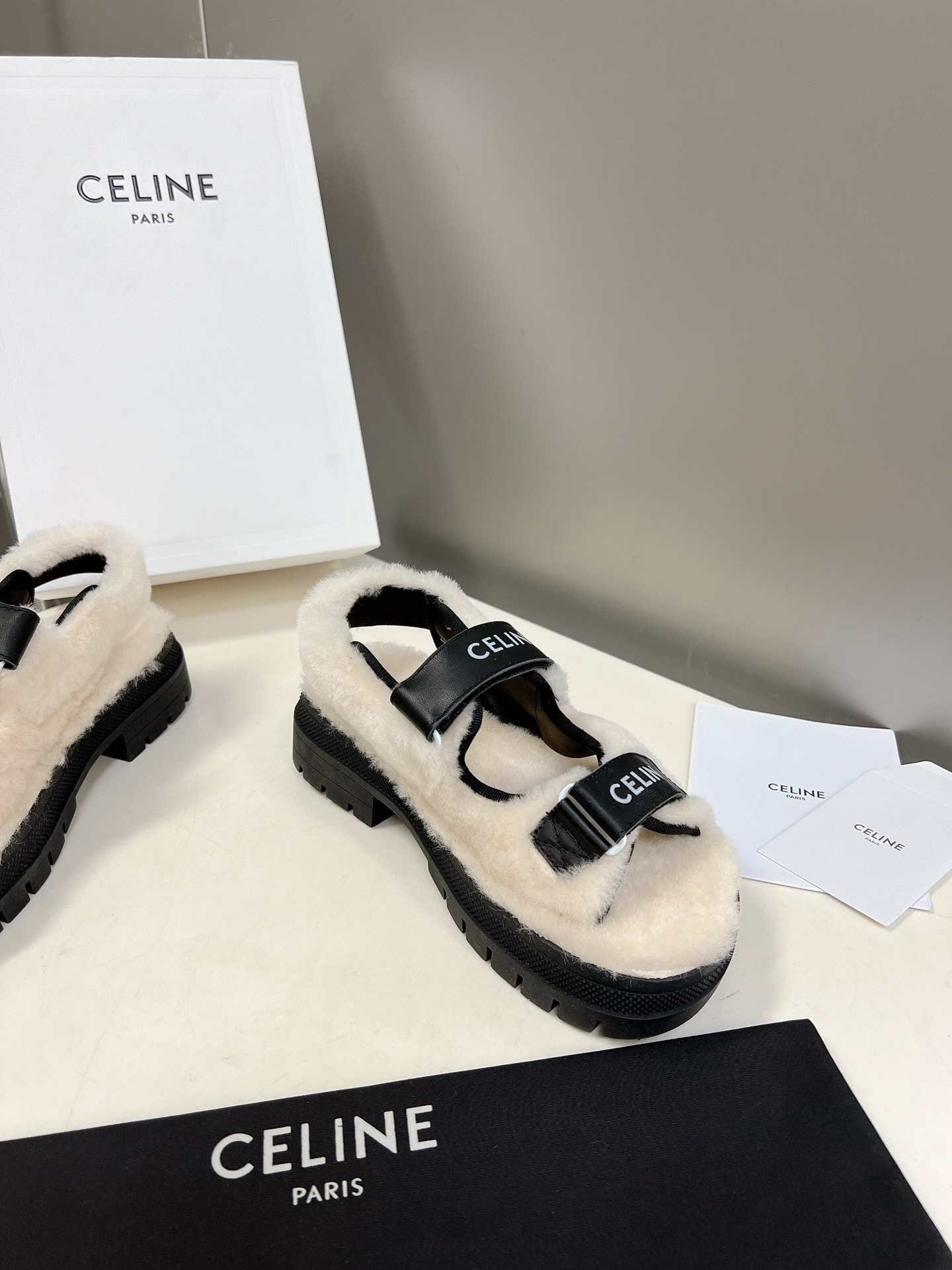 Celine Leo Scratch 凉鞋带毛皮光滑黑色