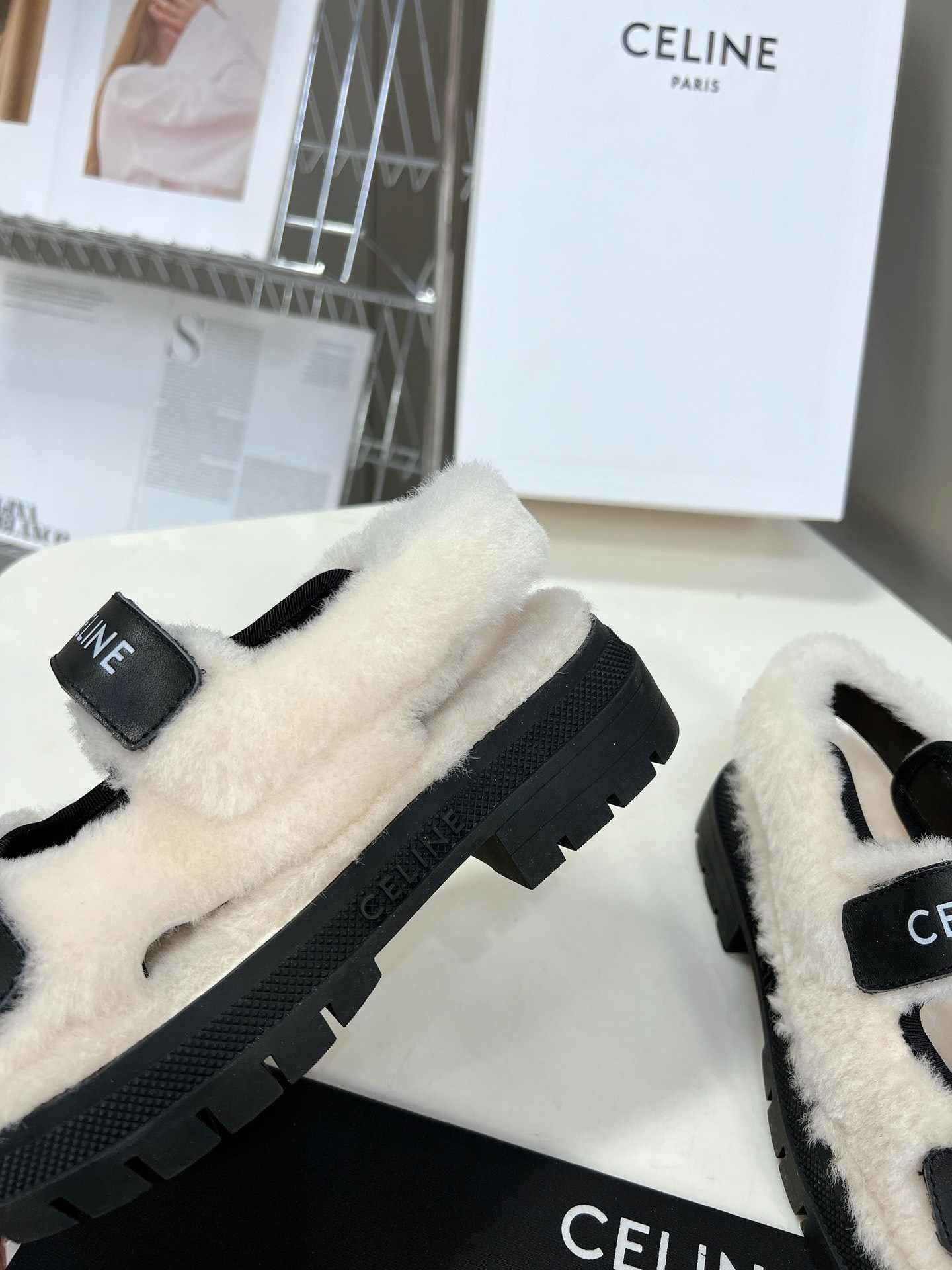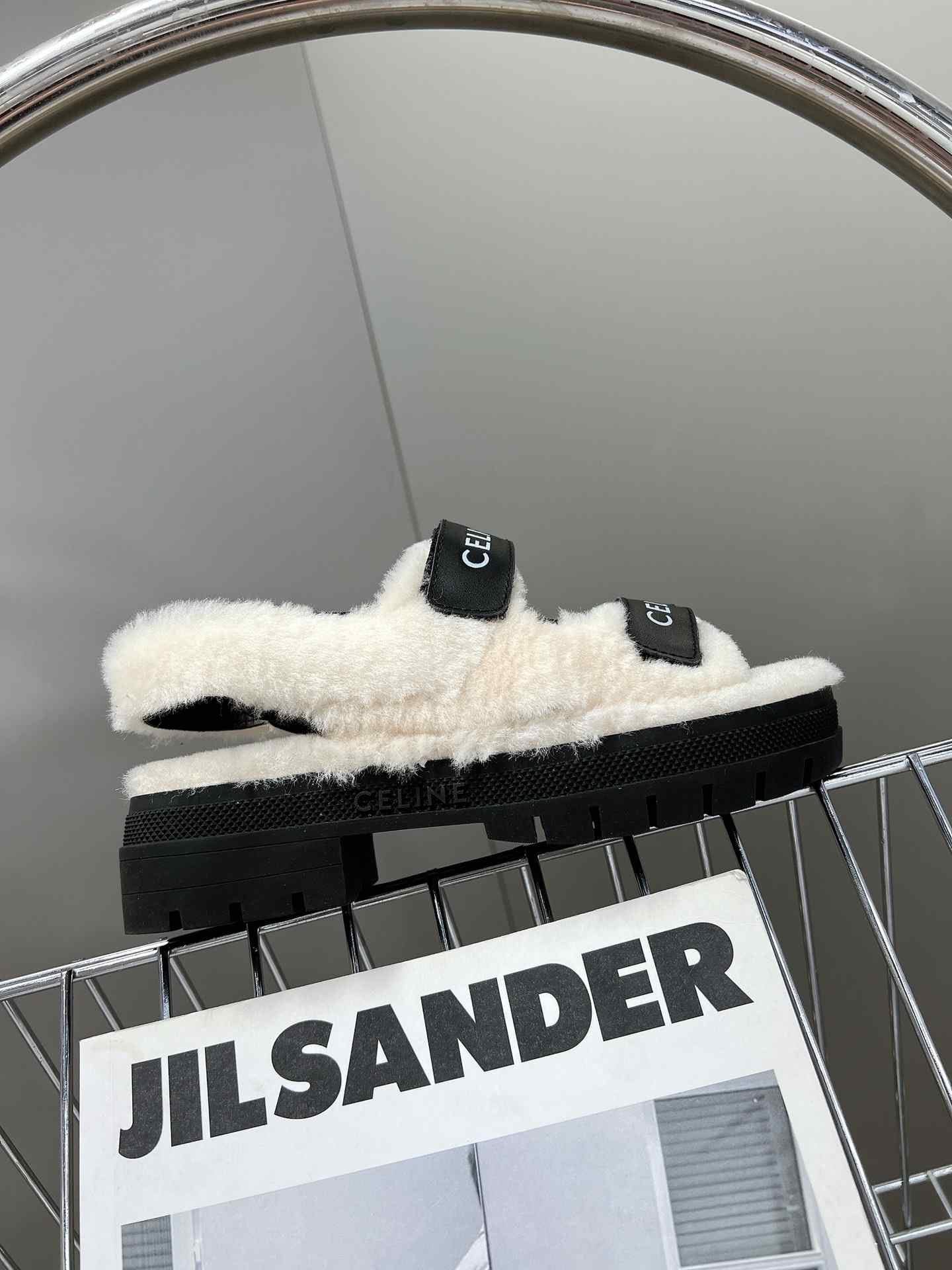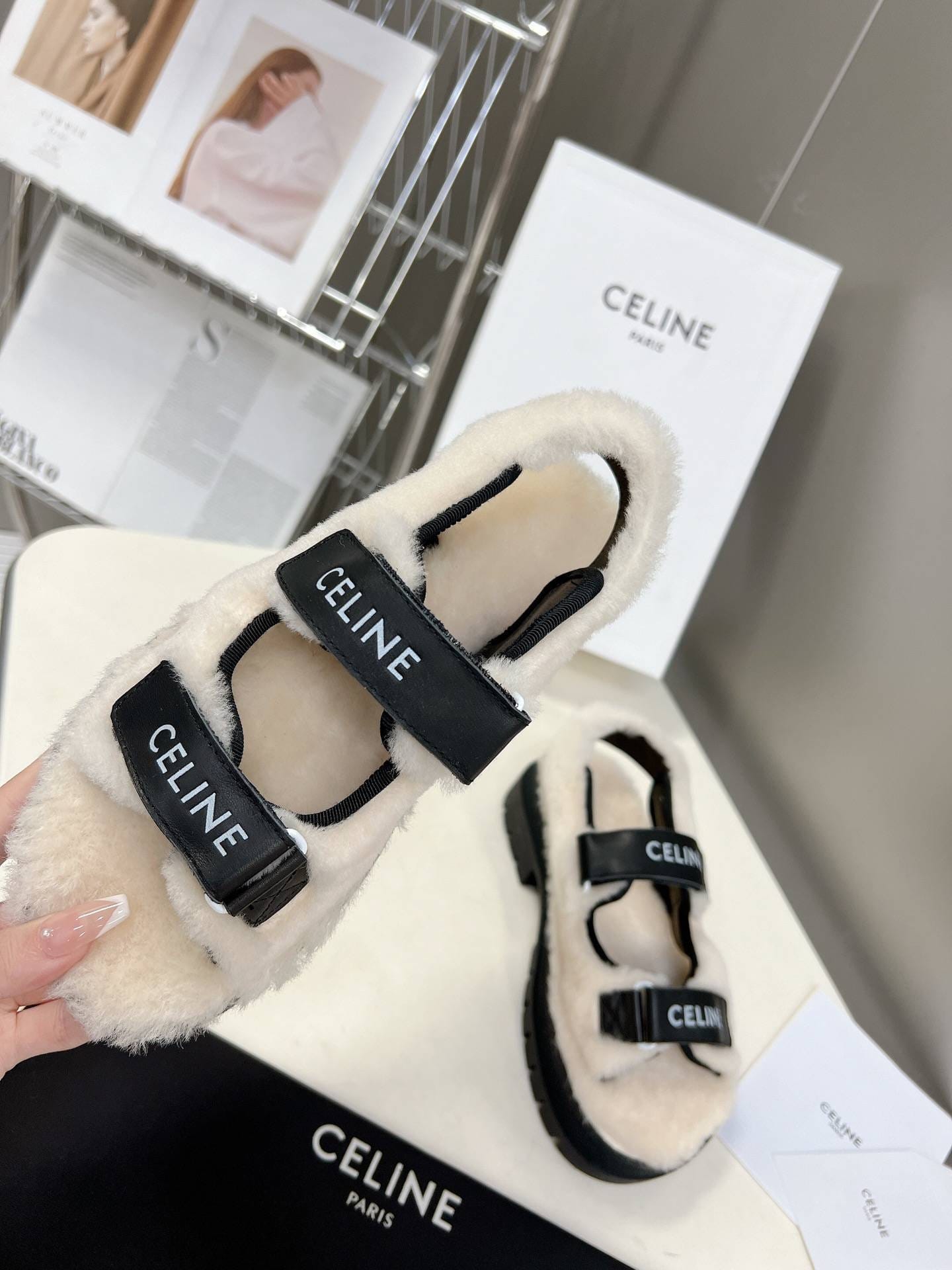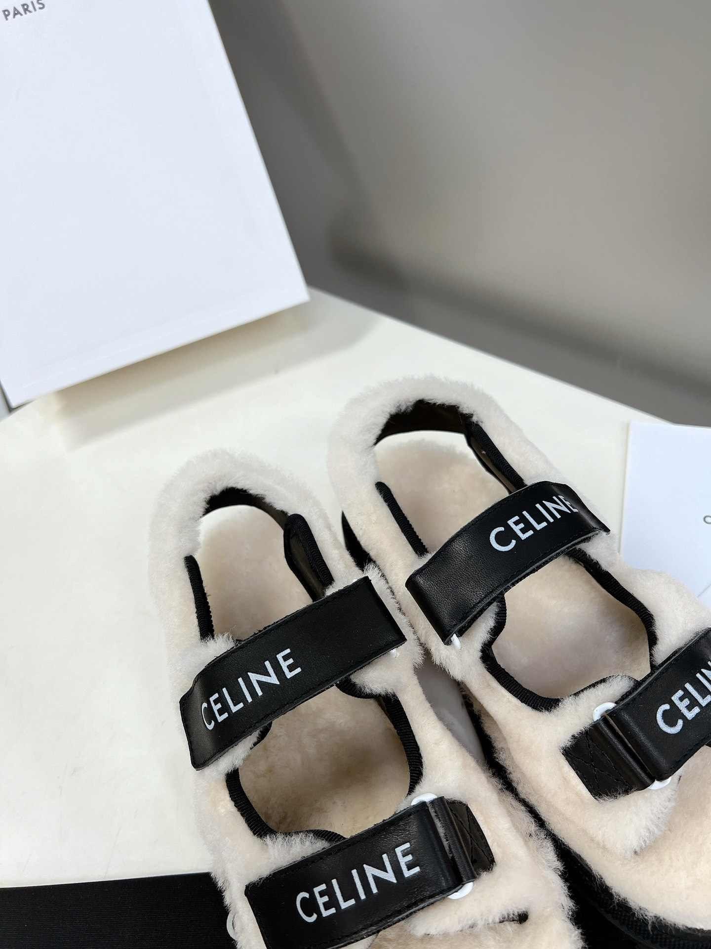 Celine Leo Scratch 凉鞋带毛皮光滑黑色