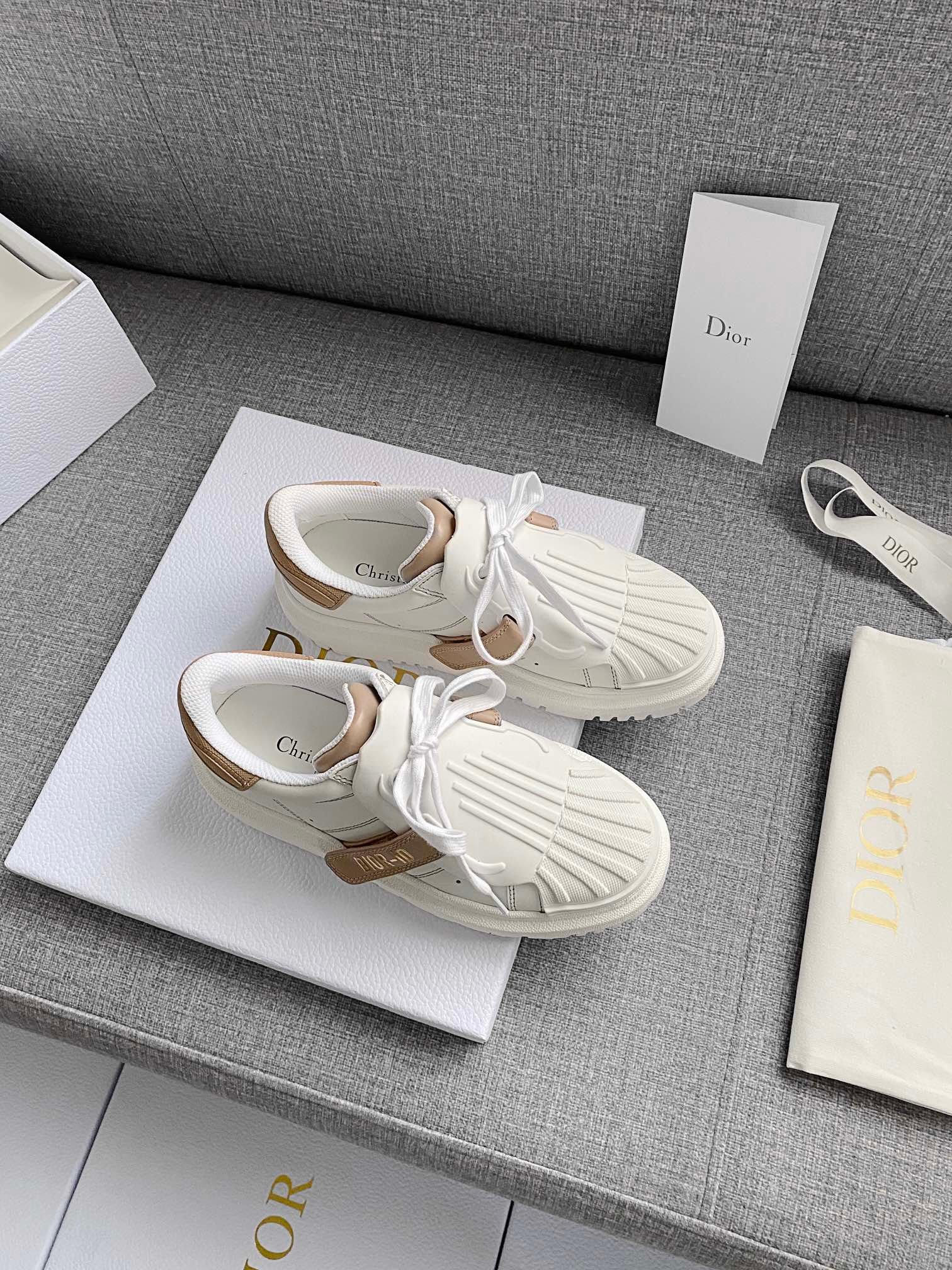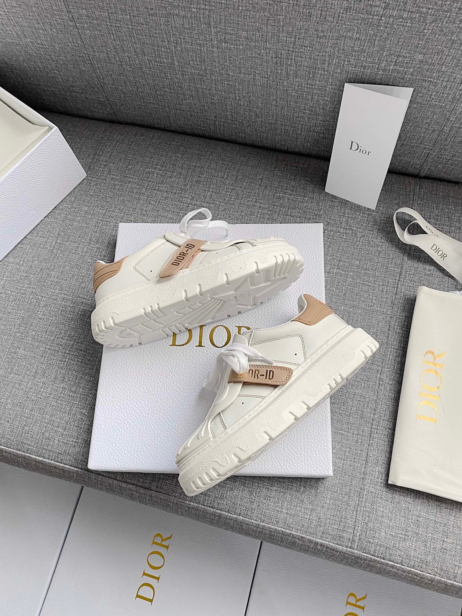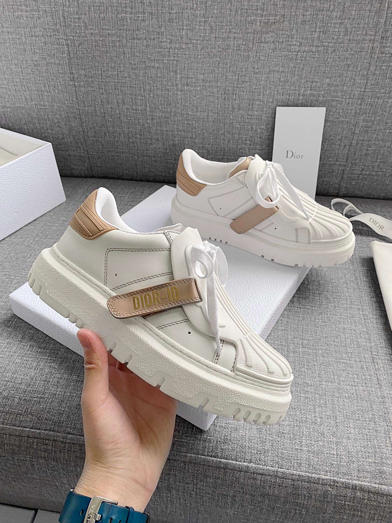Dior 为其运动鞋系列添加了全新鞋履款式。 Dior-ID 由 Maria Grazia Chiuri 设计,采用双色调设计。为了营造干净、时尚的美感,该鞋款采用白色鞋面,并饰有彩色嵌片。表带上饰有金色时尚品牌标志,尽显奢华气质。脚趾上的五条线条使鞋子更加圆润,为鞋子的整体设计增添了质感。您可以搭配一双可爱的白色渔网袜来提升您的造型。
