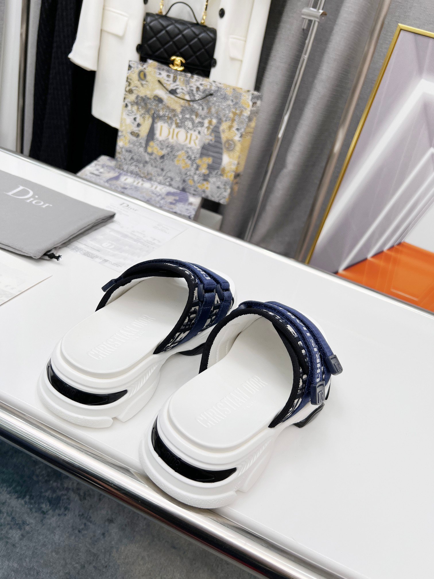 D-Wander 拖鞋是运动鞋和凉鞋的混合设计。轻盈舒适的鞋底配有防刮带,运动线条营造出轻松的感觉。鞋面的迷彩图案和每根带子上的“Christian Dior”签名使外观更加完美。
