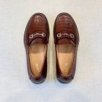 这款乐福鞋是经典正装鞋的优雅变体。该款式采用棕色粒面精制而成,正面饰有镀钯饰面黄铜“Horsebit”搭扣带。该鞋柔软耐用,橡胶鞋底带来舒适感。