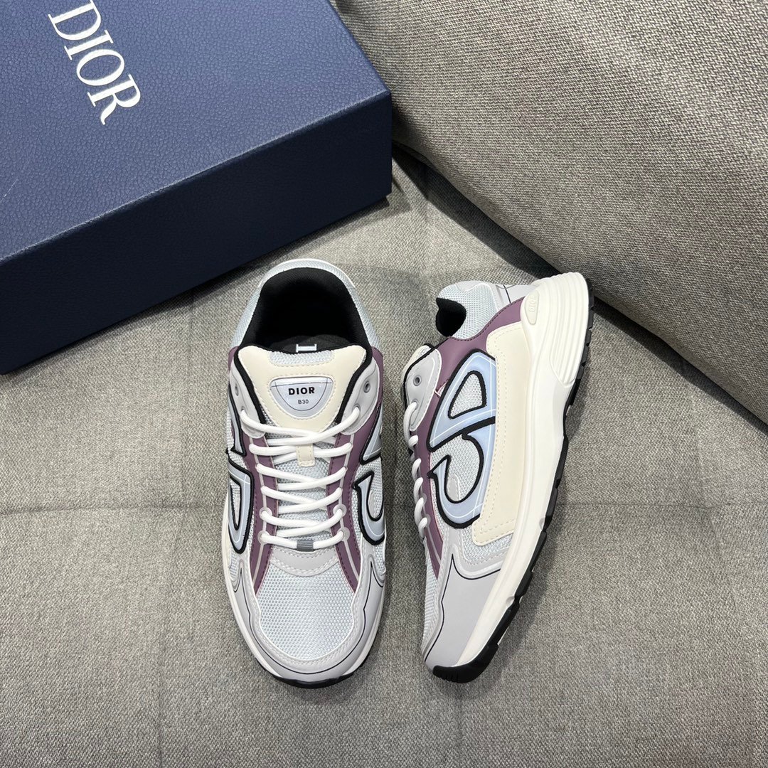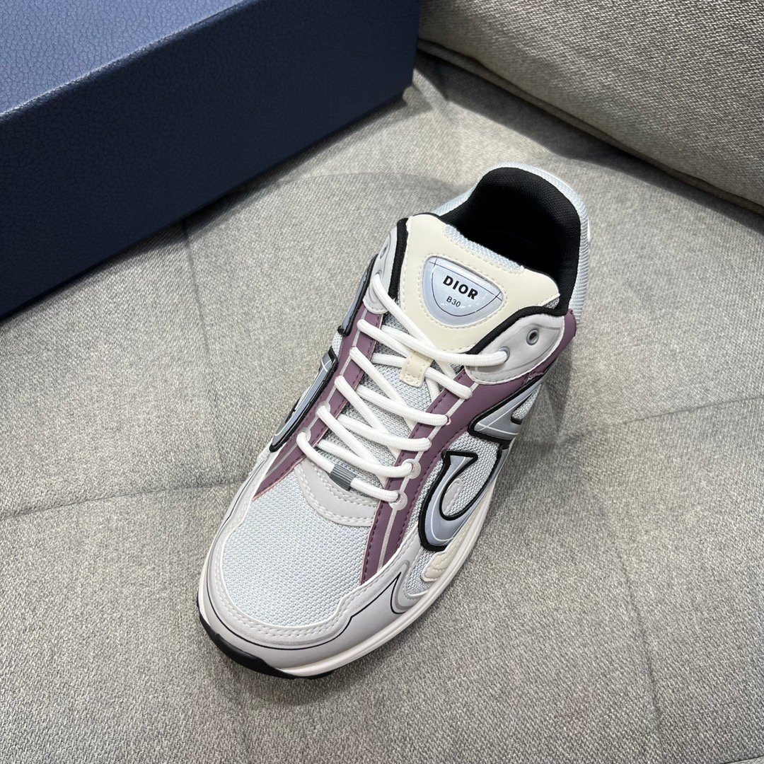 B30 运动鞋以其现代和运动的轮廓而成为新品牌的必备单品。采用白色网眼布和高科技面料制成,反光“CD30”标志更具图形美感。 B30 还在鞋舌和运动鞋后部饰有银色“DIOR B30”和“CD30”标志。雕刻而成的超轻橡胶外底凸显了各种标志性细节,而弹性内部则提供了最佳的舒适度。 B30 运动鞋可搭配任何休闲装束。