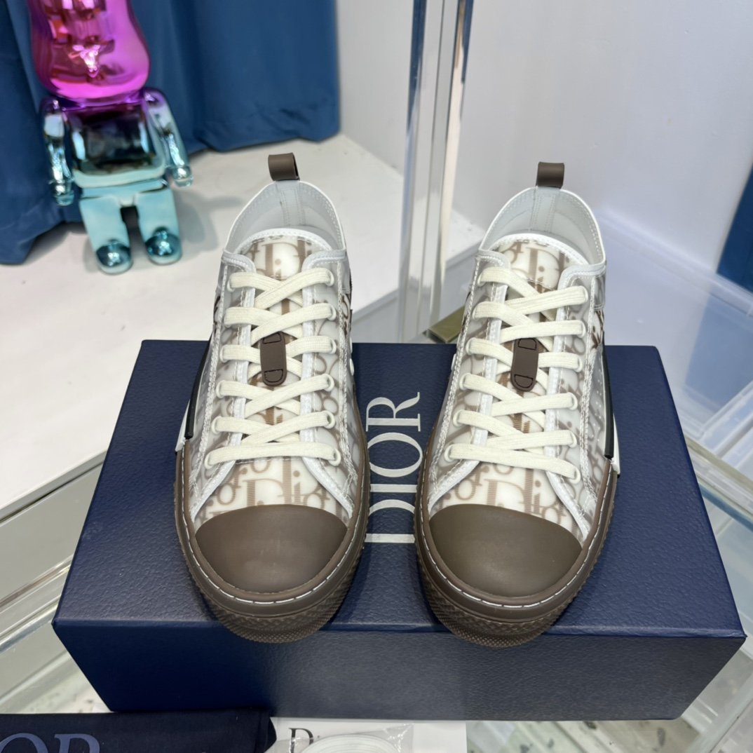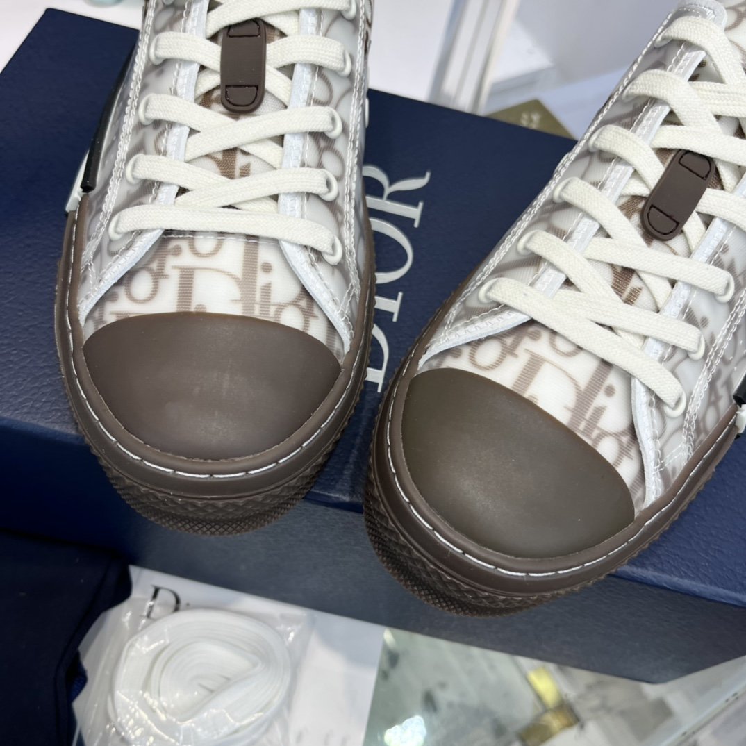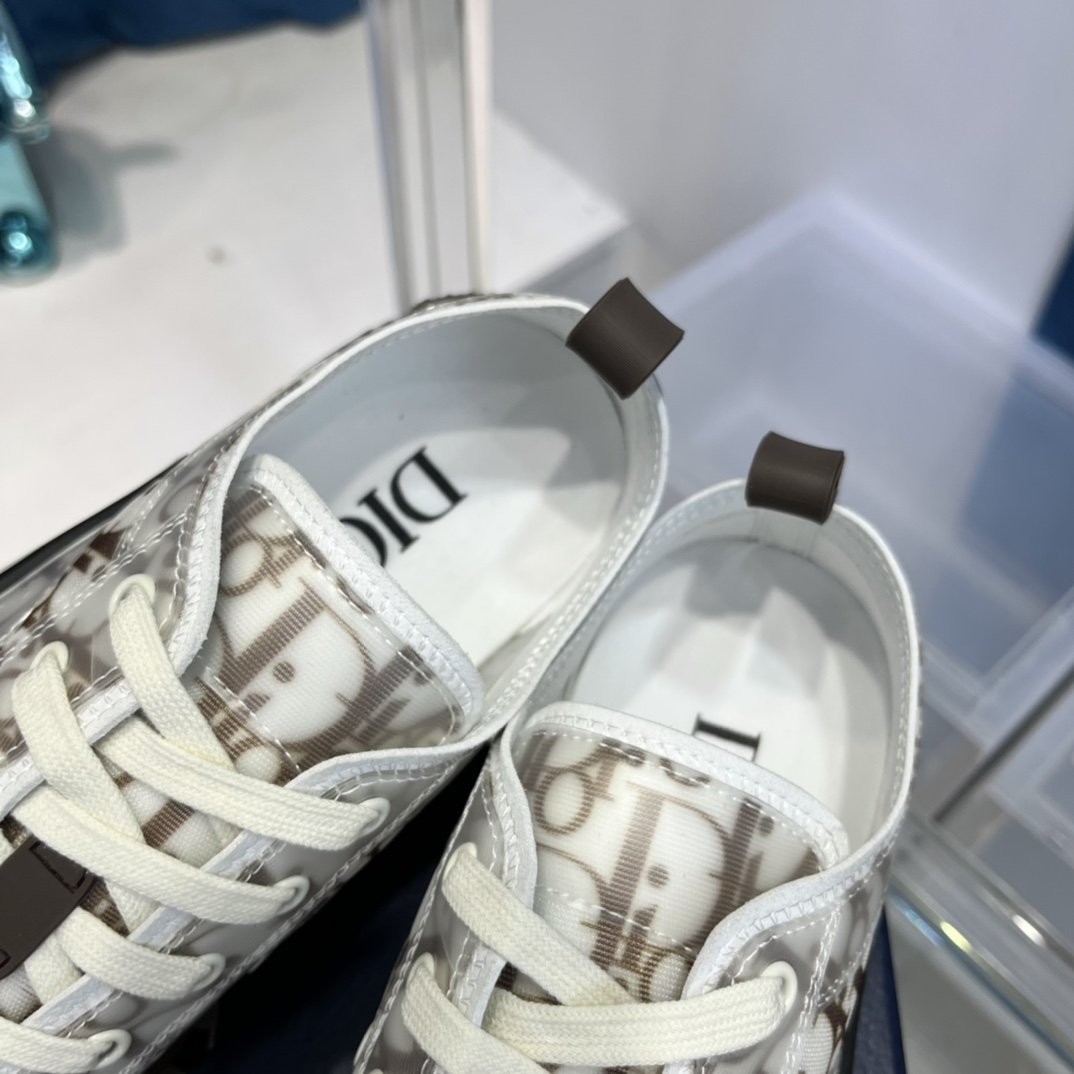 B23 低帮运动鞋以其白色和黑色 Dior Oblique 图案和透明镶板而与众不同。基本细节,如孔眼和前系带、白色和米色橡胶鞋底、圆形加固脚趾以及后拉环,让人想起经典低帮款式的风格。这款运动鞋两侧的对比细节进一步增强,包括“DIOR”标志,可轻松搭配任何休闲服装。