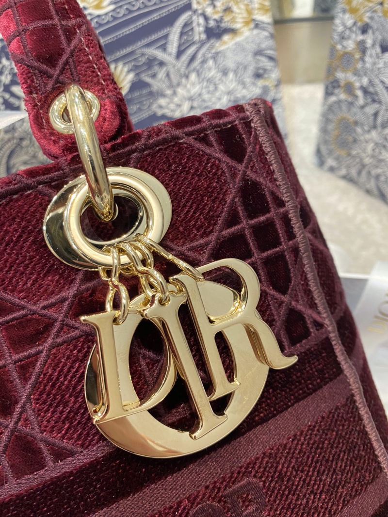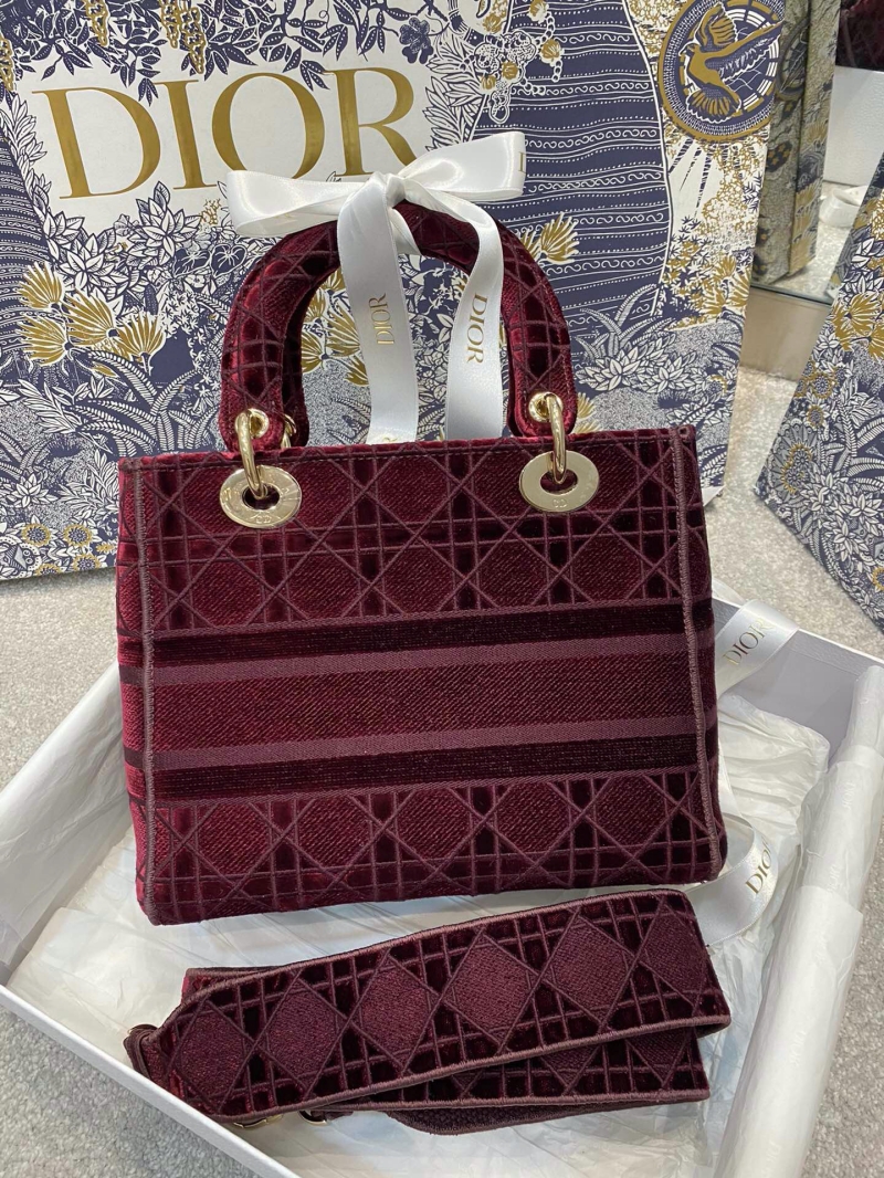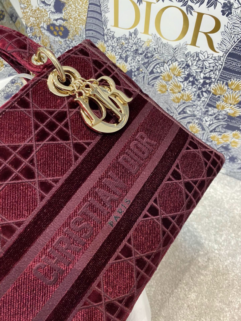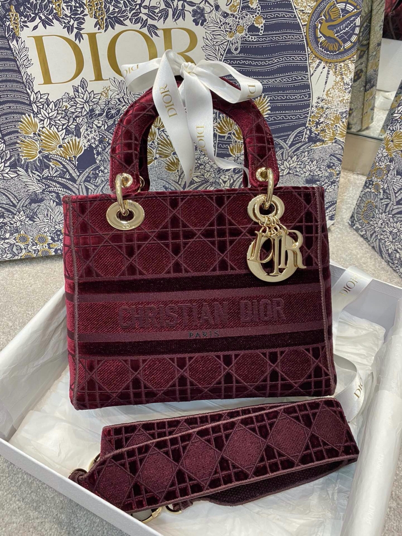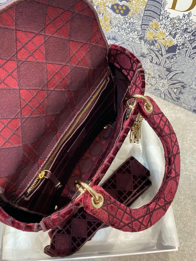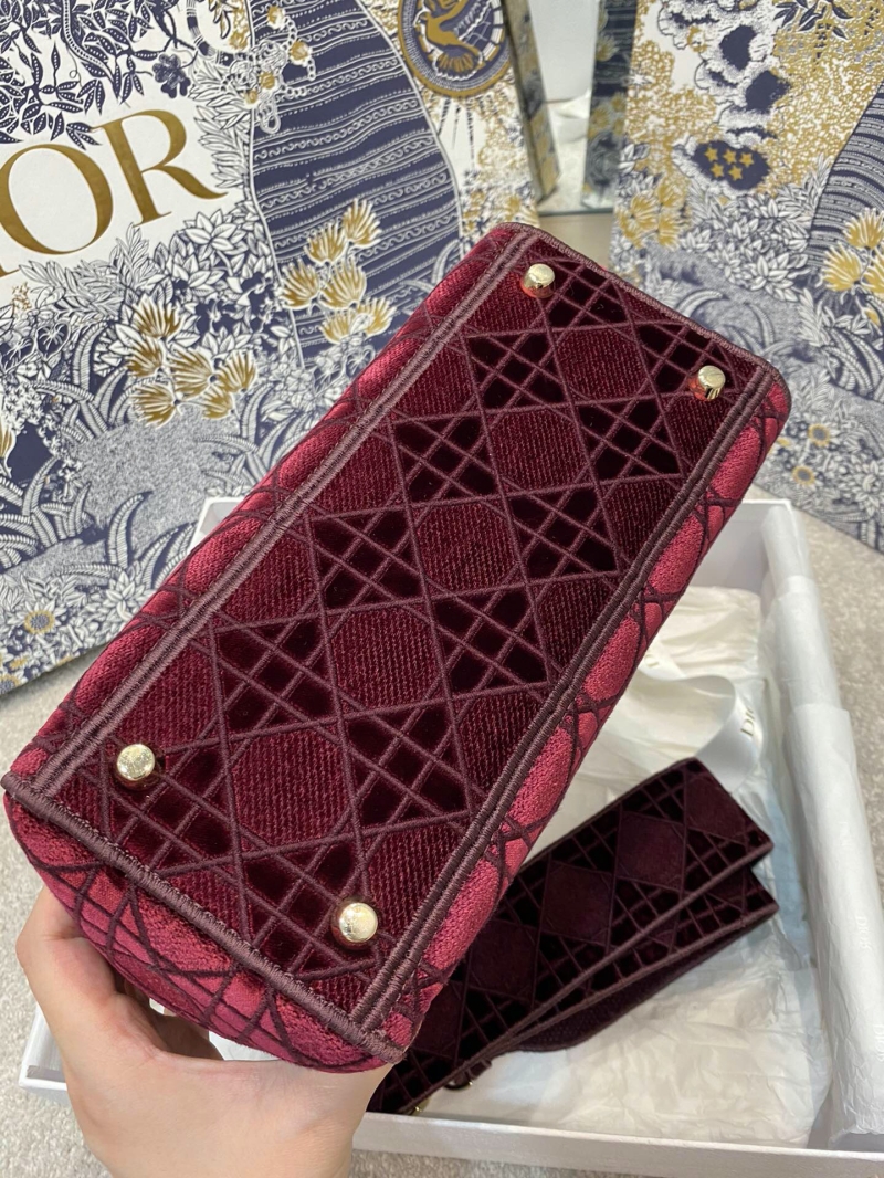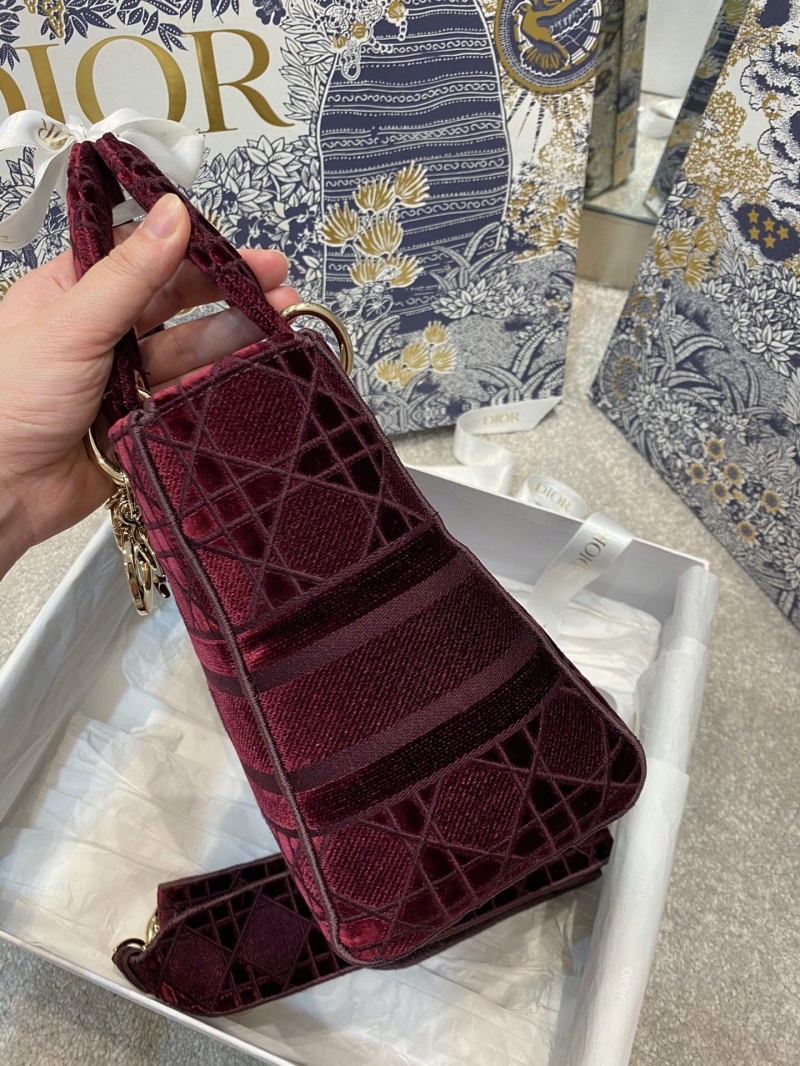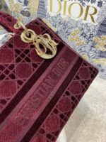 - M0565 迪奥Dior 中号 Lady D-Lite 手袋 天鹅绒刺绣藤格纹 酒红色