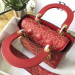 - 结构:Lady Dior红色小牛皮柔软手提包,缀以饰钉Cannage经典藤格纹图案“D.I.O.R”吊饰复古金色金属配饰宽肩背带斜挎与手提两用