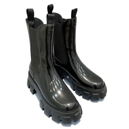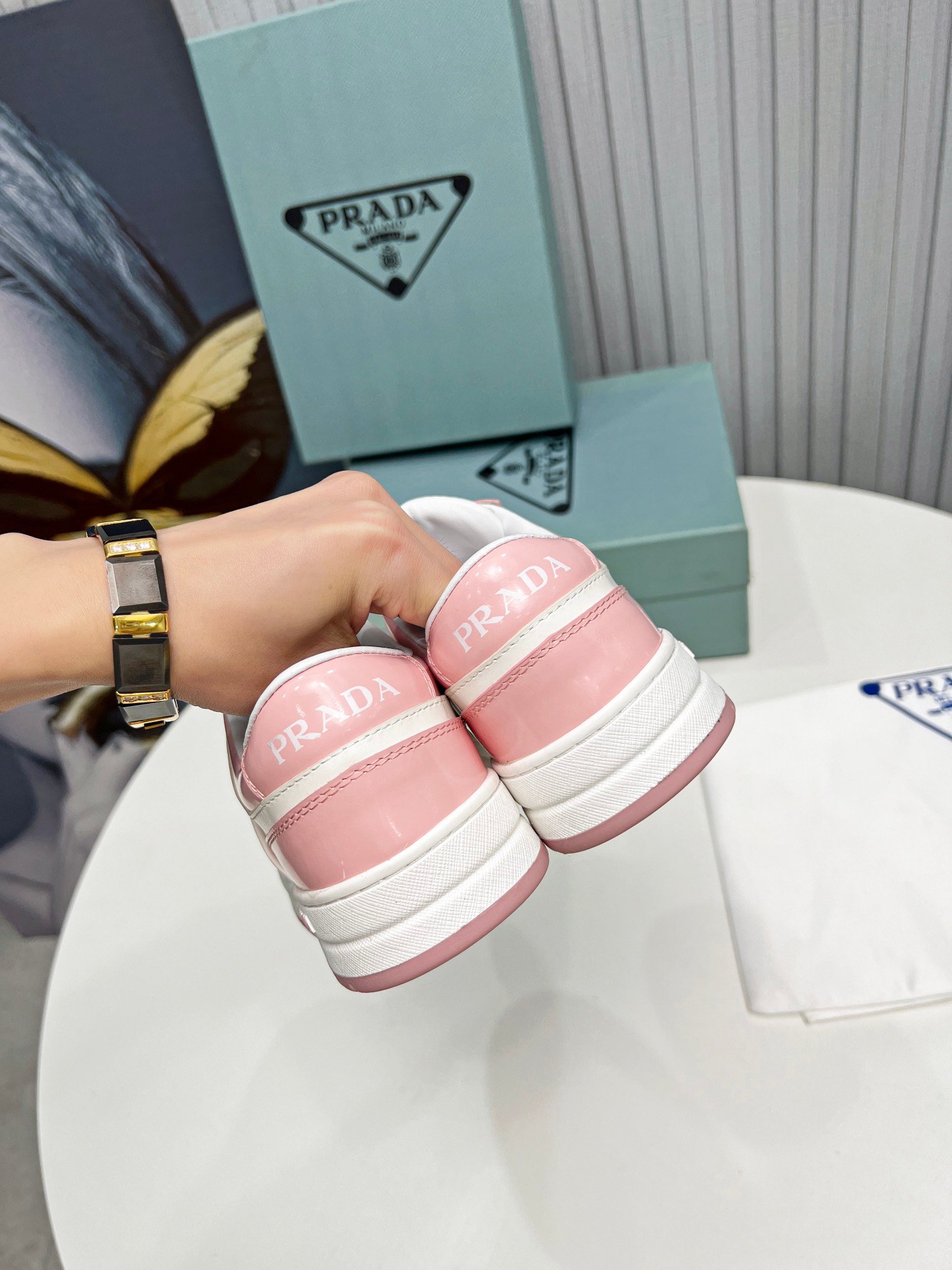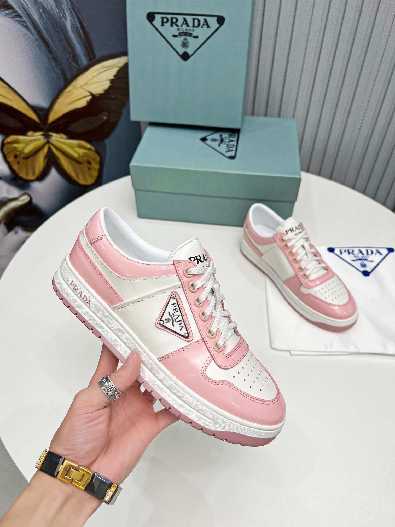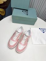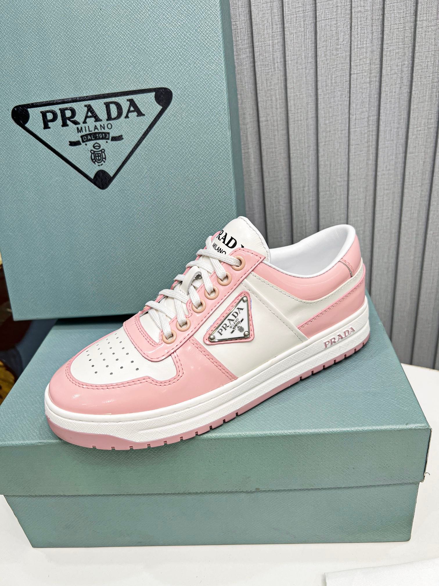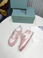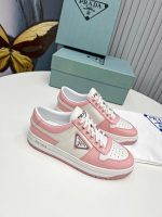 Downtown Sneakers 是一款运动鞋,饰有不同诠释的 Prada 标志,出现在鞋舌上、沿着浅色鞋底,以及鞋面侧面的珐琅金属三角形标志。新的颜色对比强调了鞋子的线条,创造了形状的动态组合。