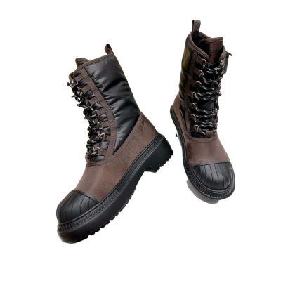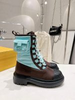 特别版 FD Domino 机车靴,庆祝 Baguette 包 25 周年,侧面配有 Baguette 口袋。粉色尼龙材质,带有棕色细节。橡胶凸纹鞋底,尖端印有浮雕 Fendi 字样。