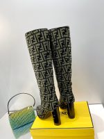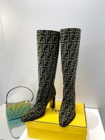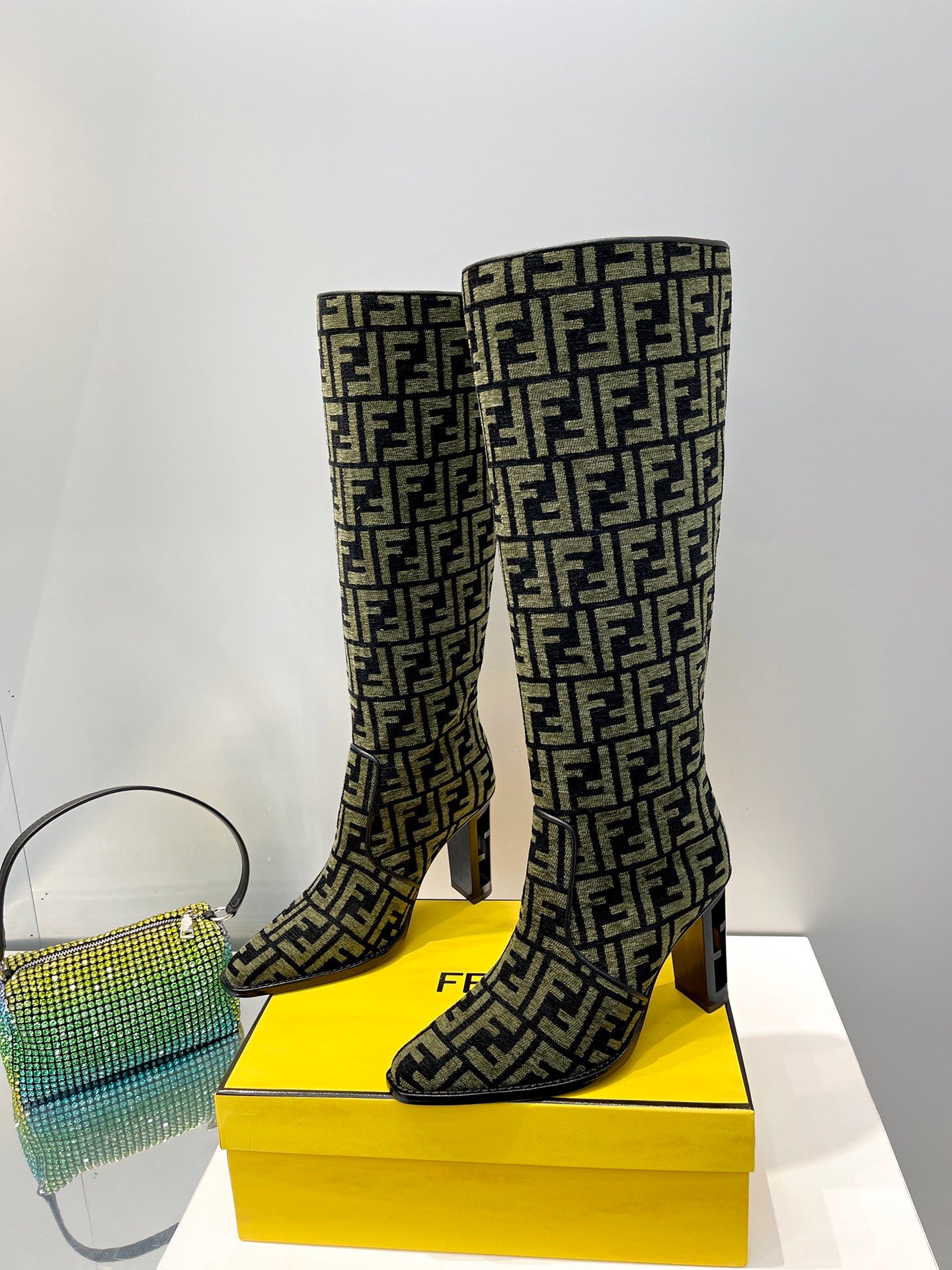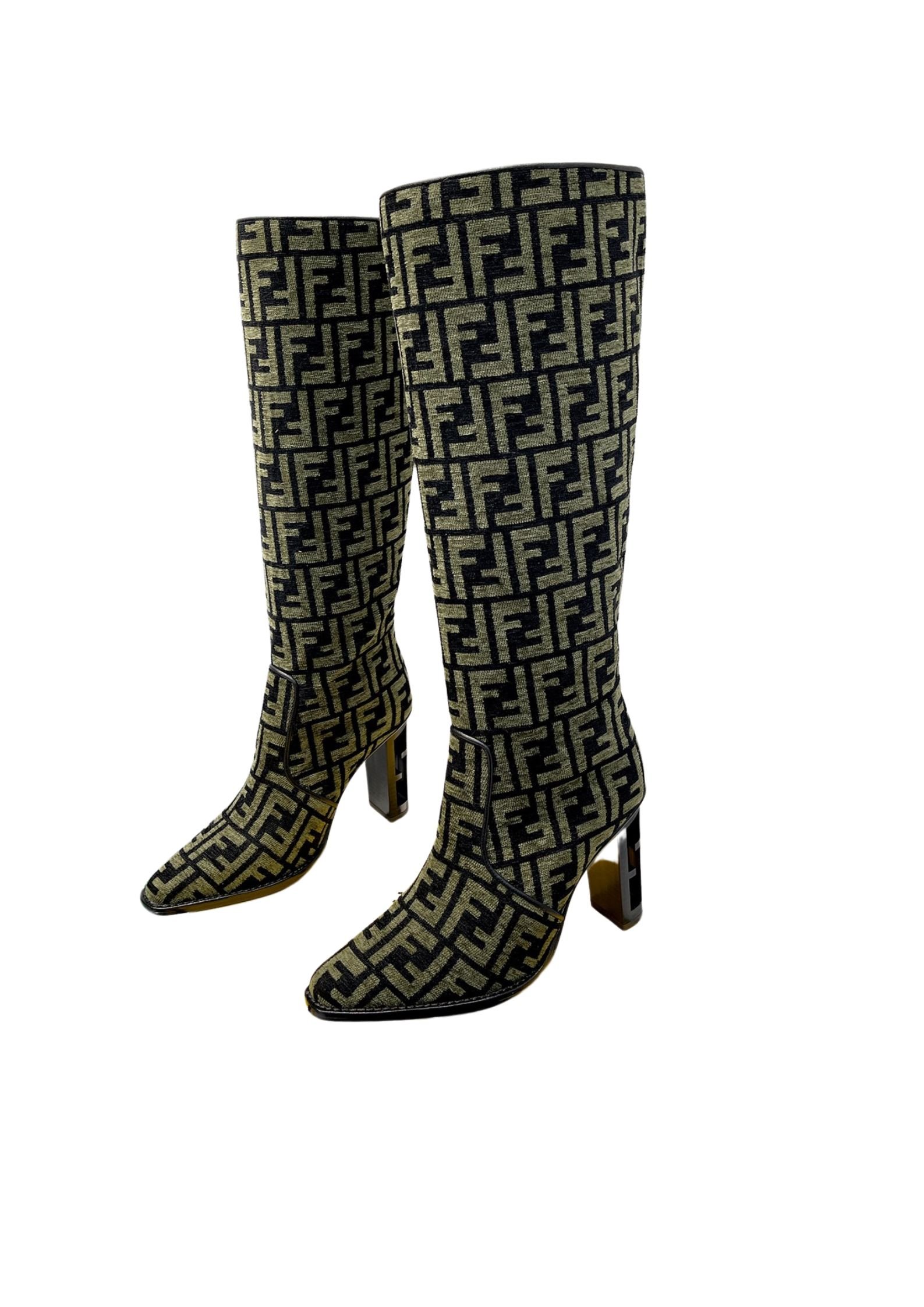 Baguette FD 剪裁高跟 FF 雪尼尔靴子,方头。雪尼尔材质,深绿色和黑色提花 FF 图案。鞋跟镶嵌 FF 图案。