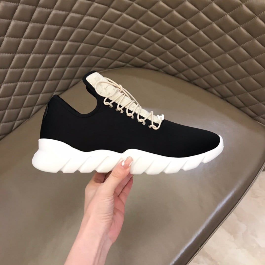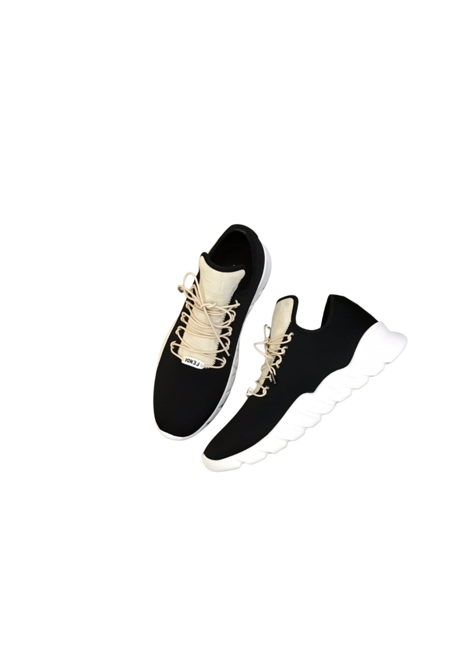 Fendi Faster 运动鞋采用灰色网布制成。鞋舌饰有 FF 图案和交叉松紧鞋带。黑色细节,金属 FF Baguette 图案。波纹跑步鞋底,脚趾上有 FF。