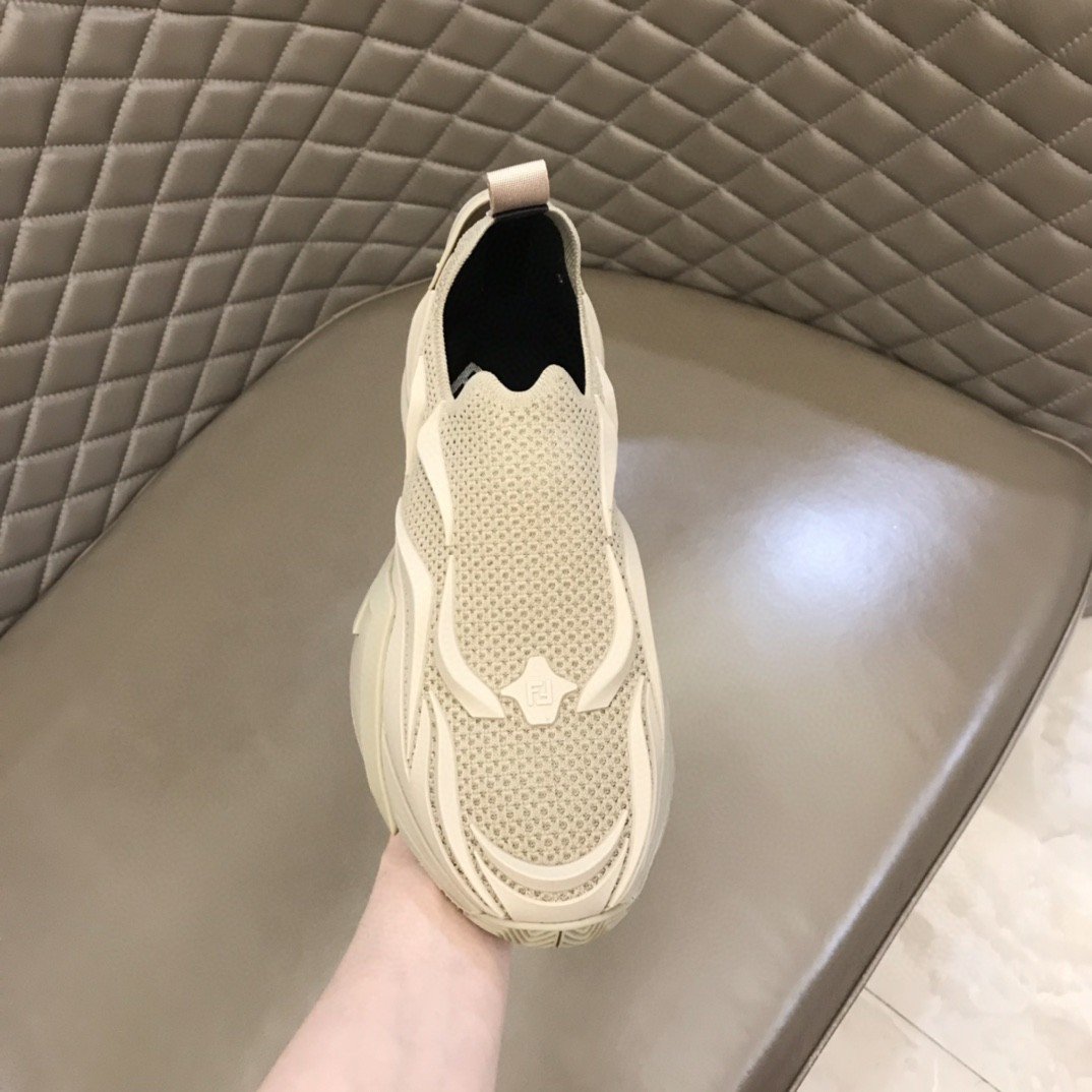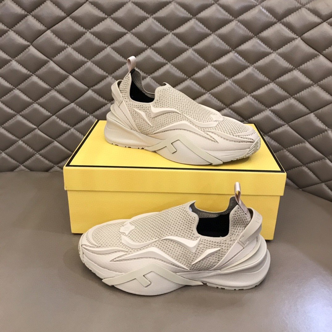 一脚蹬运动鞋,波纹鞋底,鞋跟上刻有 F. FD Fendi Flow Running Sneakers 字样压花。由网状材料制成。同色系橡胶细节采用创新手工技术装饰。
