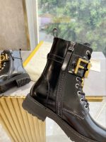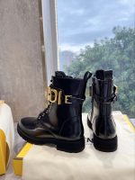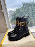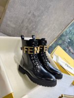 FD Fendigraphy 机车靴是圆头战斗靴,用鞋带和 Fendi 刻字带固定。金色金属件。