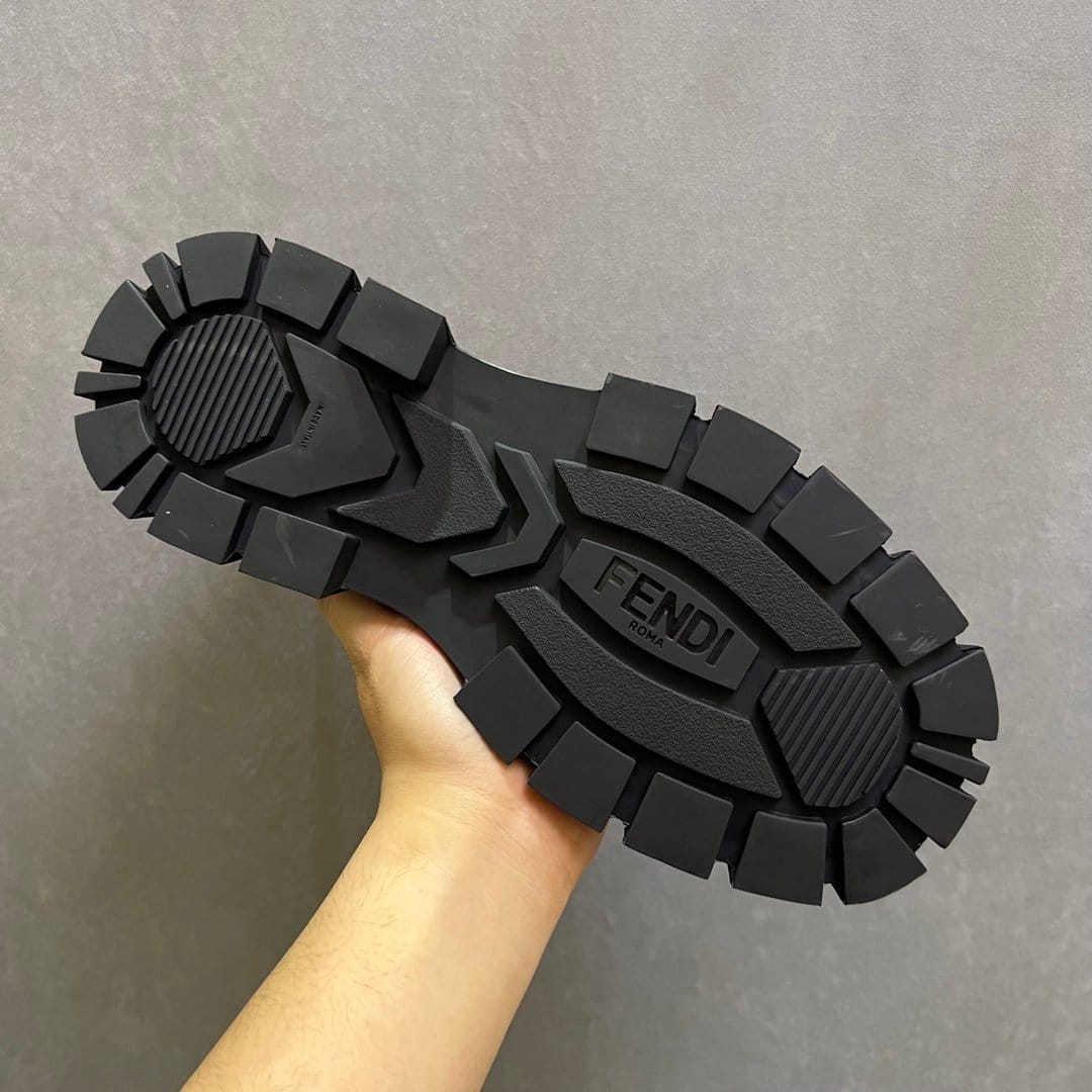 Fendi Force 系带鞋。棕色和黑色 FF 提花面料细节。衣领修剪。浅色橡胶鞋底,后跟处有浮雕 FF 细节。