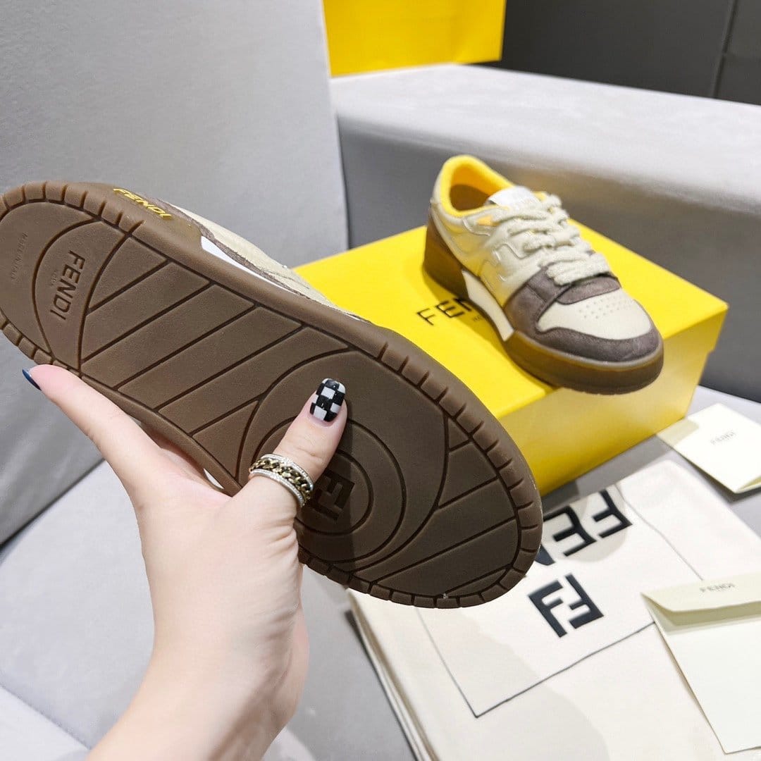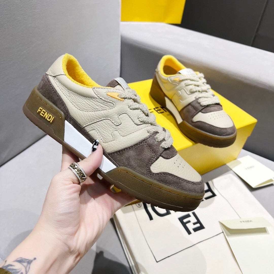 FD Fendi Match 低帮运动鞋鞋舌上饰有复古标签,设计紧凑。侧面缝有 FF 图案,鞋底压纹 Fendi 字样。饰有同色系衣领和鞋带。带缓冲垫的包覆橡胶鞋底。