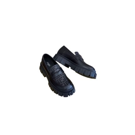 乐福鞋采用可见缝合鞋围,鞋面饰有 Fendi OLock 细节。黑色正绒面革制成。黑色和灰色提花 FF 面料鞋围。同色系珐琅金属配件。压纹橡胶鞋底。