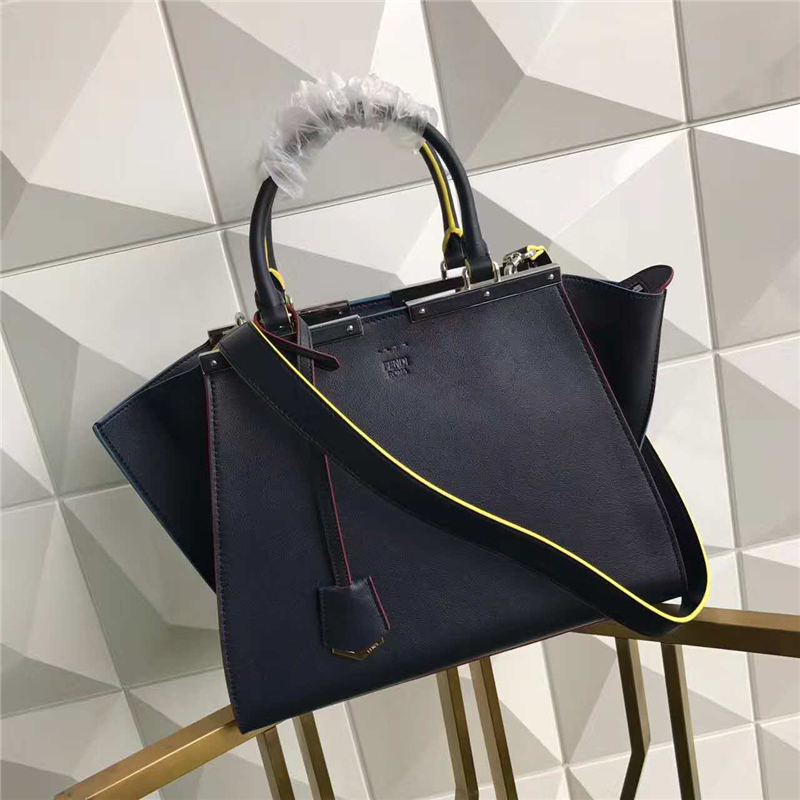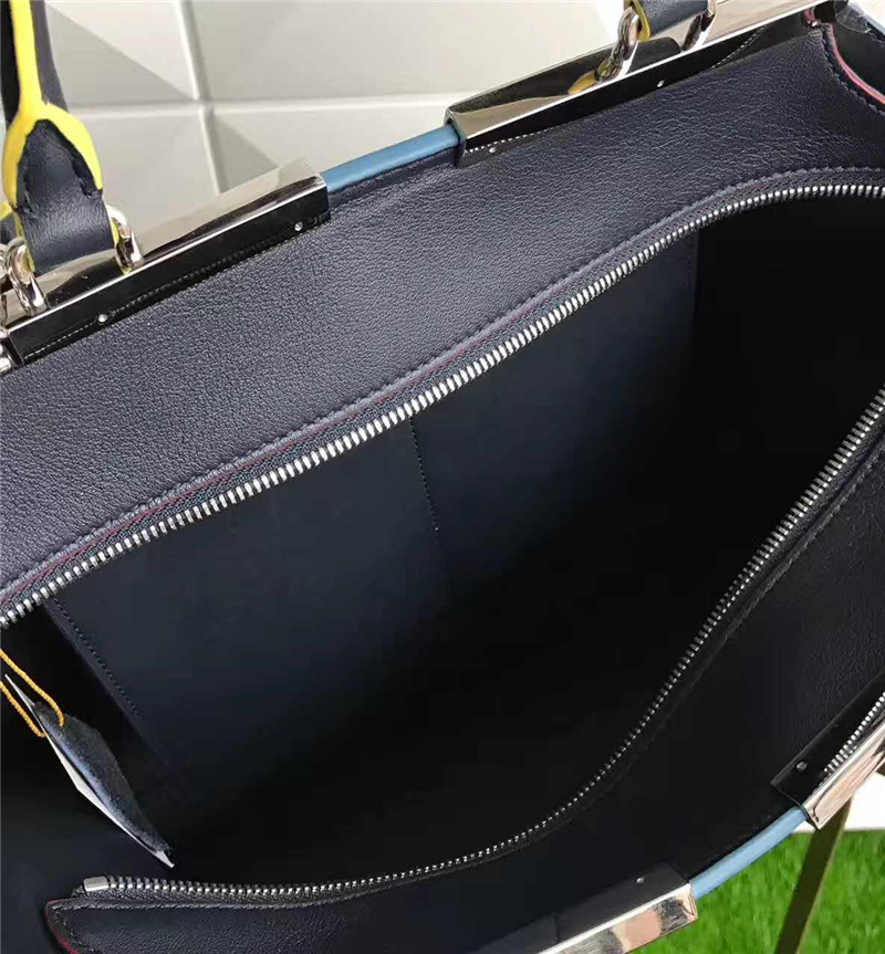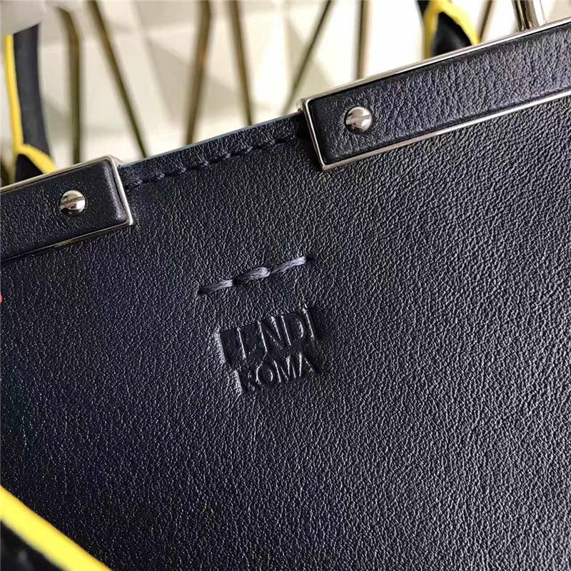 - 详细介绍:FENDI 柔软小牛皮购物包,彩色毛边装饰。亚光碳色珐琅装饰条,镀钯轮廓和金属配件。顶部拉链。软羊革衬里,附大拉链袋。手工缝制扣孔条和FENDI ROMA标志