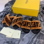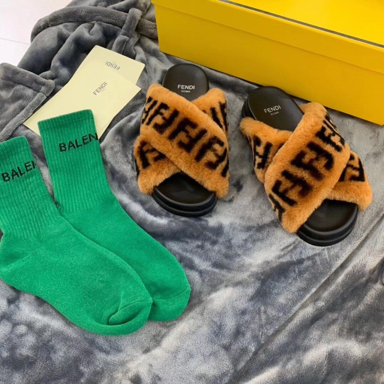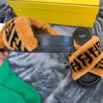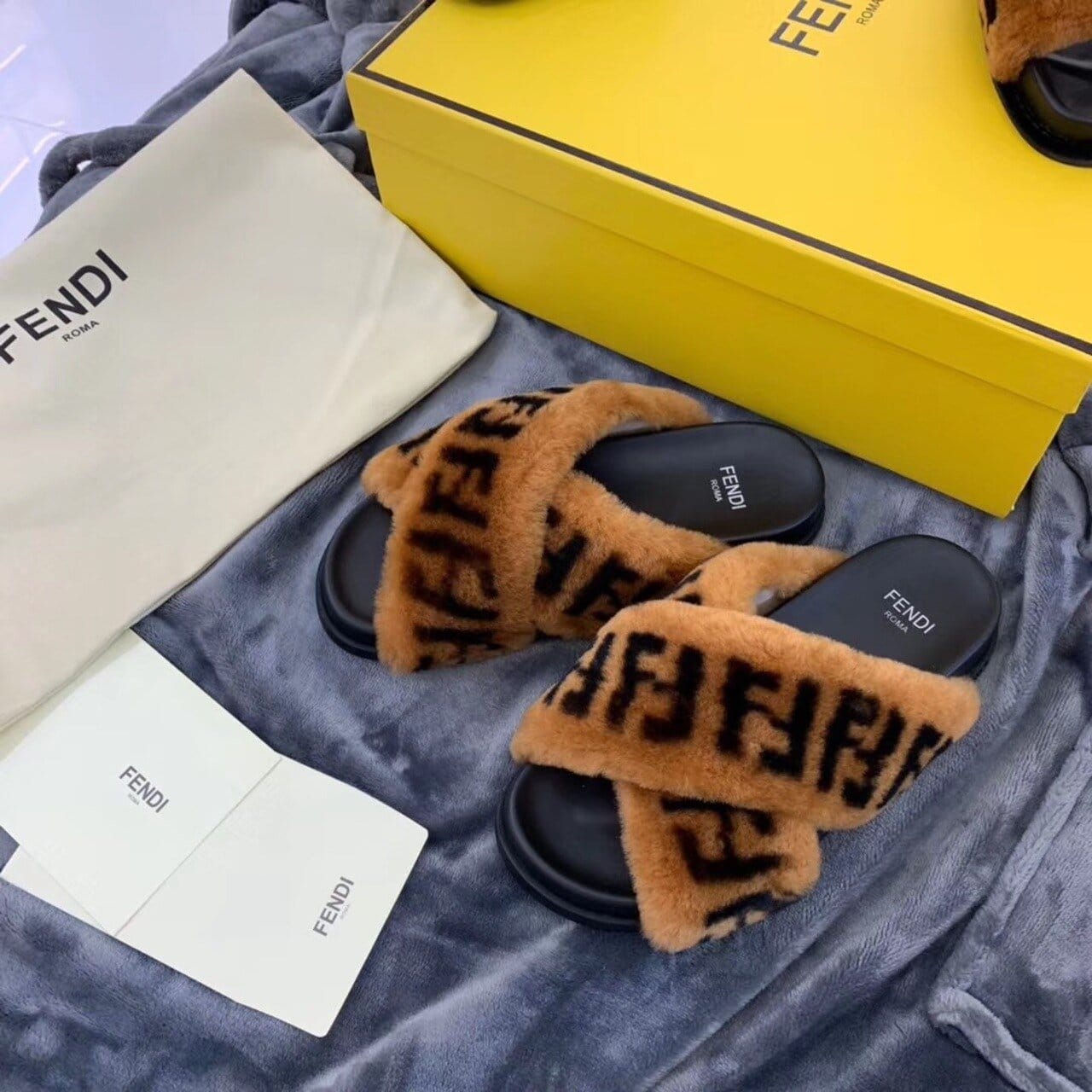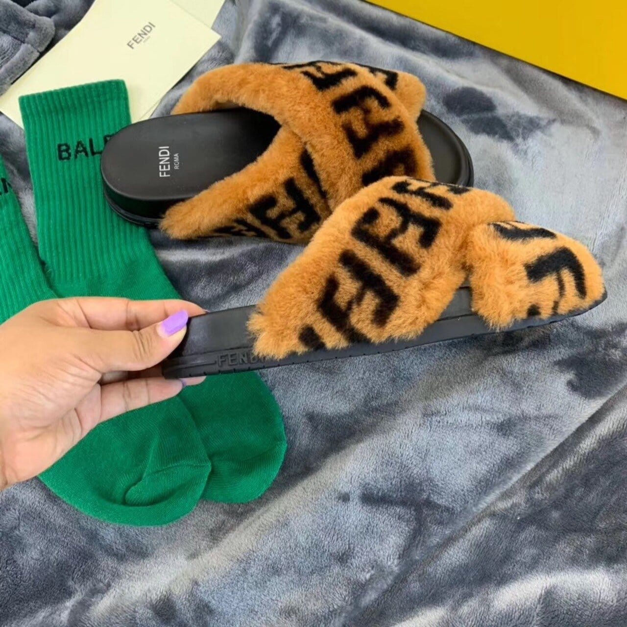 Fendi 羊毛皮 FF 徽标皮革和皮革染色剪羊毛毛十字拖鞋 2019 秋冬系列,黑色/棕色