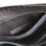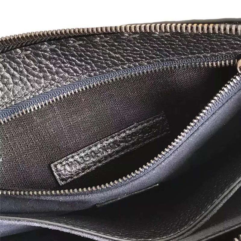 - 结构:手挽带和拉链封口。三个内夹层,带八个卡片夹层、一个宽大接裆式票据夹、收纳包和拉链袋。镀钯金属配件。