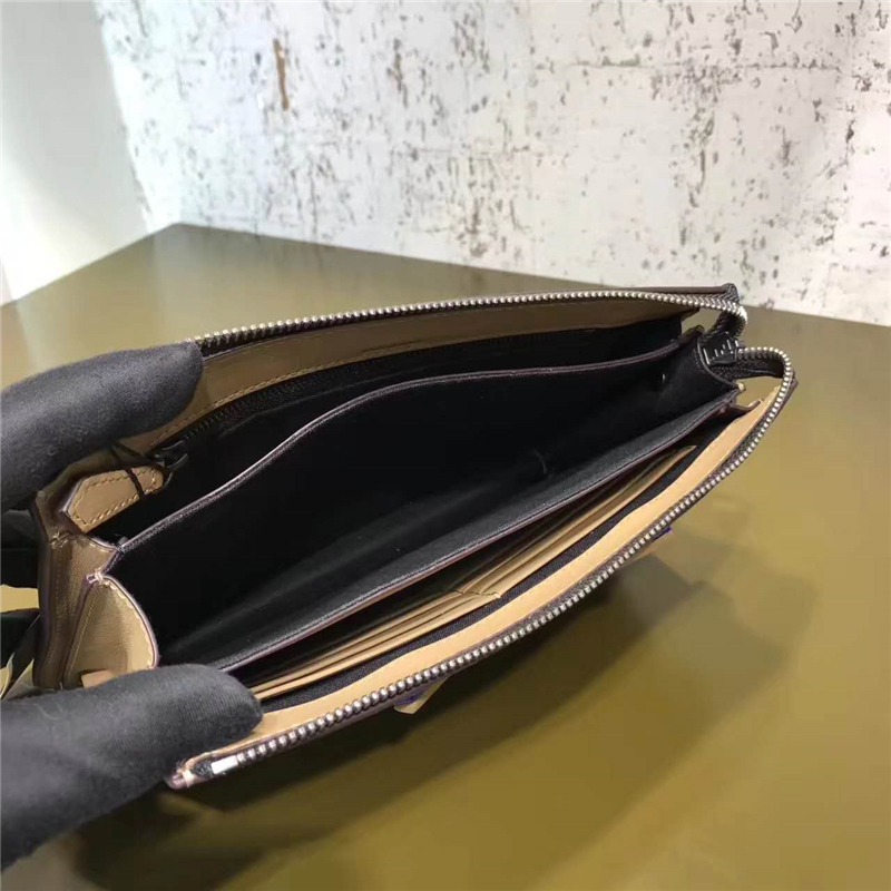 - 结构:手挽带和拉链封口。内设3个隔层,8个卡片夹层,1个宽大的接裆式口袋,1个整理袋。拉链门襟,镀钯金属件。