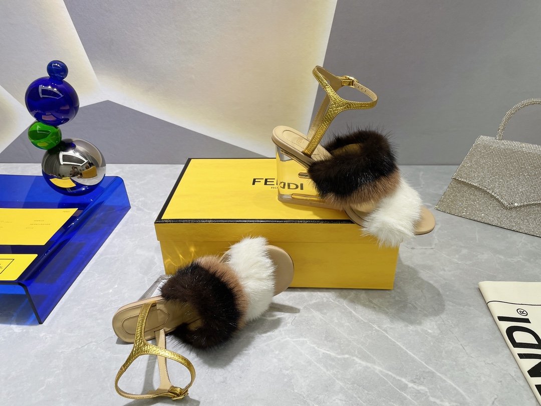 Fendi First 凉鞋配有两条宽带和带子。由白色、棕色和黑色水貂制成。饰有金色层压艾尔斯蛇皮表带。金色金属斜F形雕刻鞋跟,透明有机玻璃覆盖。