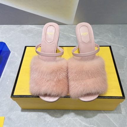 Fendi First 宽带和带子凉鞋。粉色羊皮材质。同色系细节。金色金属斜F形雕刻鞋跟。