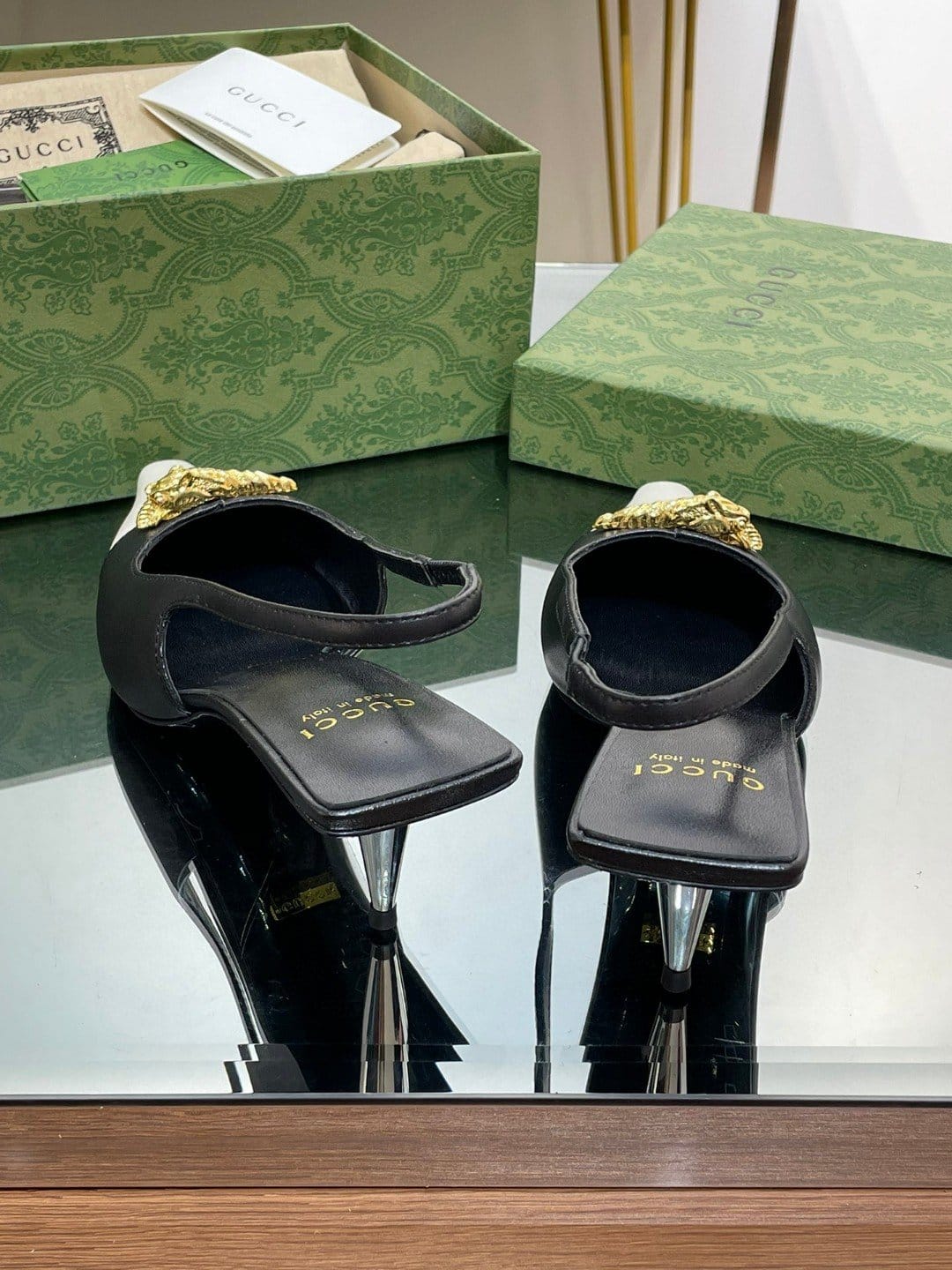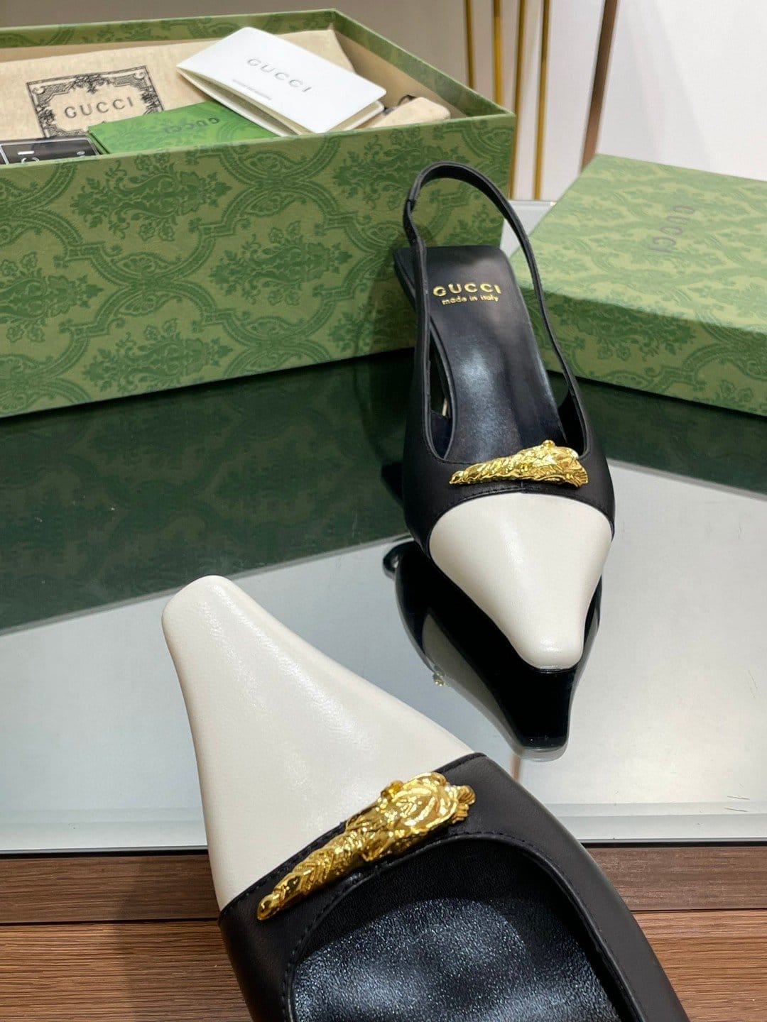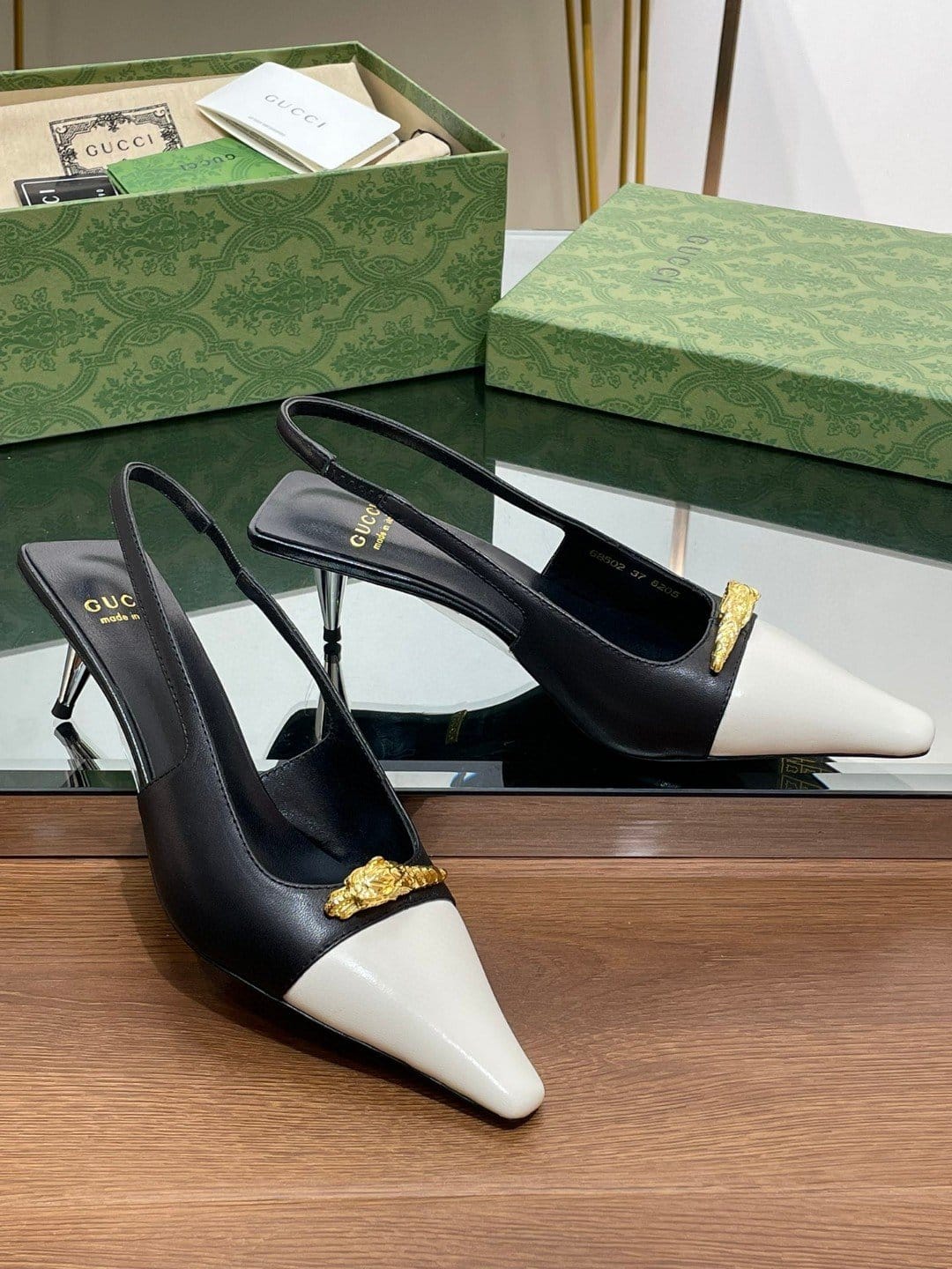 反映图案的历史起源。几十年来,设计硬件的金色调在每个系列中脱颖而出。在这里,这双中跟露跟高跟鞋呈现出现代风格,添加了以下元素。