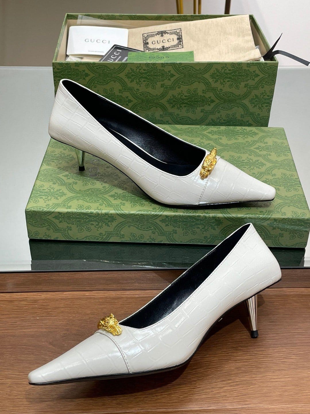 这双高跟鞋在经典廓形上进行了演绎,其特点是金属细高跟,营造出现代感。尖头完成设计。