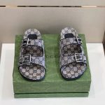 一双平底凉鞋,采用灰色花押字帆布制成。 GG 标志首次使用于 1970 年代,是 1930 年代原始 Gucci 菱形设计的演变,从那时起,它就成为 Gucci 传统的既定象征。