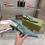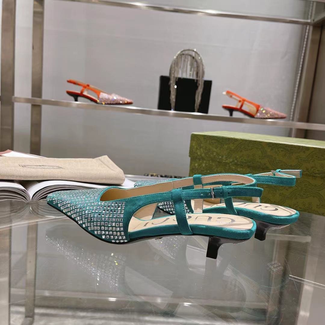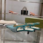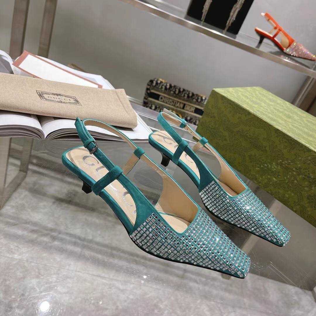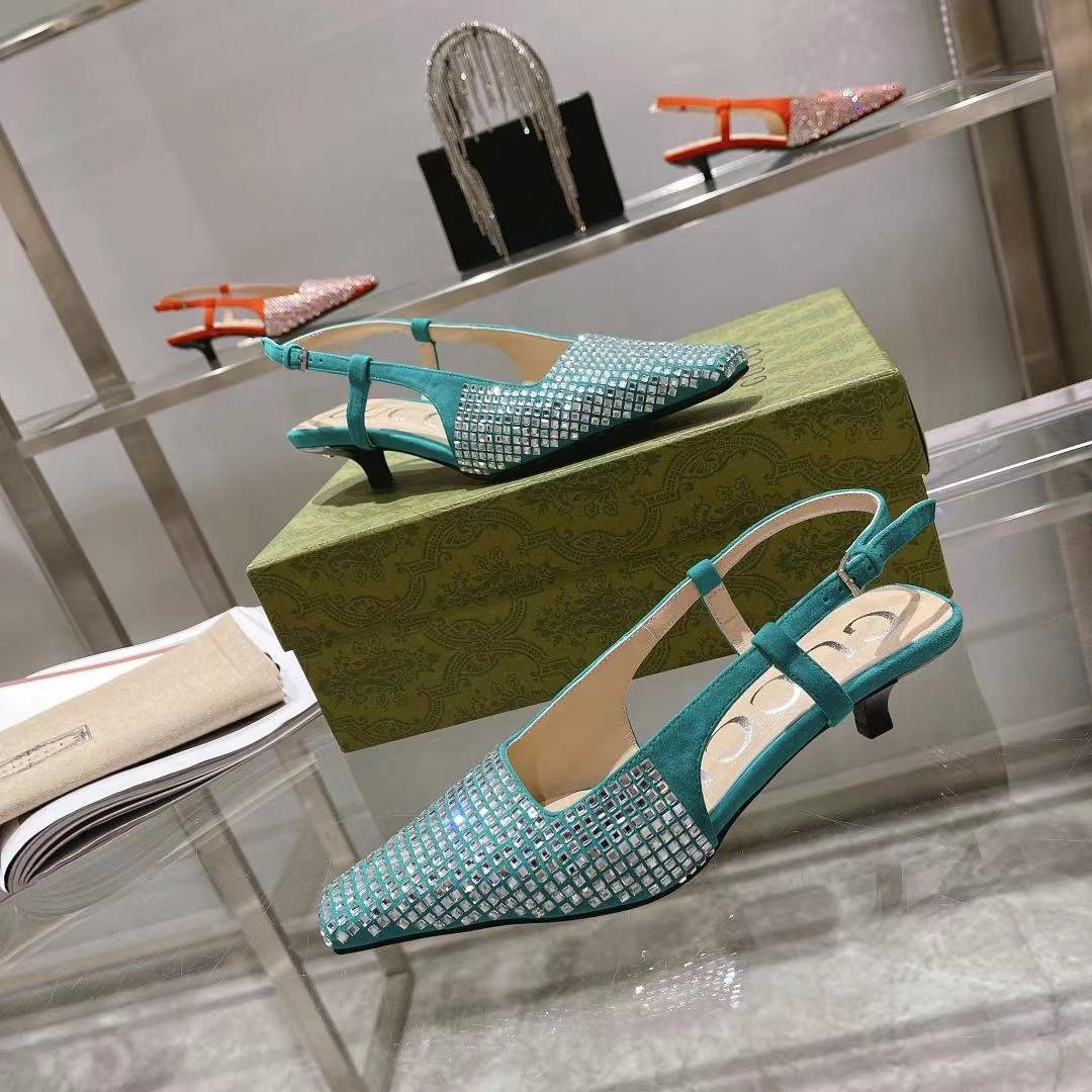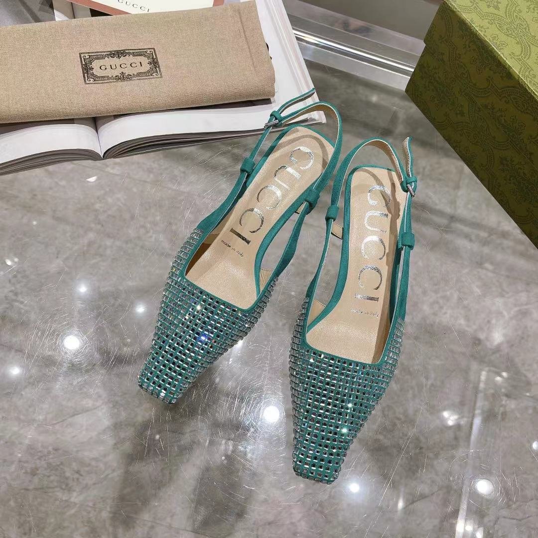 Gucci Aria 系列借鉴了 90 年代和 2000 年代初的档案,其中的单品灵感来自 Tom Ford 的 Gucci 时代。女性气质的新理念展现了迷人的细节,如蕾丝、水晶和透明面料。这双露跟鞋采用翡翠绿帆布制成,带有闪亮的 GG 图案。