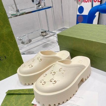GG 标志首次使用于 20 世纪 70 年代,是 1930 年代原始 Gucci 菱形设计的演变,从那时起这是 Gucci 传统的既定象征,每一季都在演变。在这里,字母组合以剪裁图案的形式出现在这些绿色橡胶凉鞋上。