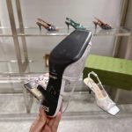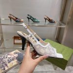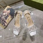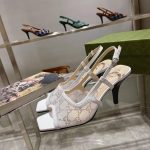 Gucci Aria 系列借鉴了 90 年代和 2000 年代初的档案,其作品灵感来自 Tom Ford 时代在古驰。女性气质的新理念展现了迷人的细节,如蕾丝、水晶和透明面料。这双露跟中跟鞋采用白色网布材质,饰有闪亮的 GG 图案。