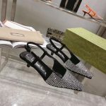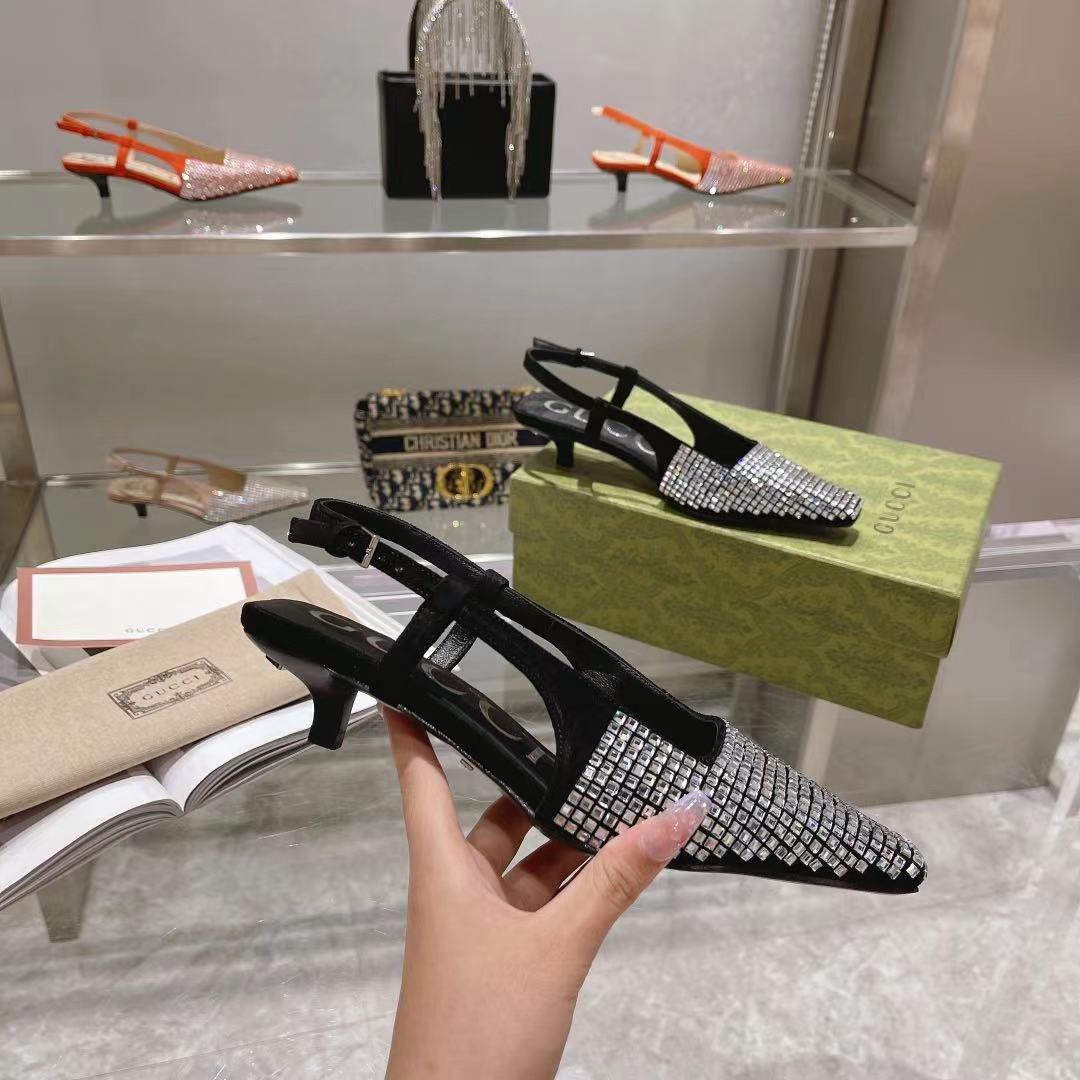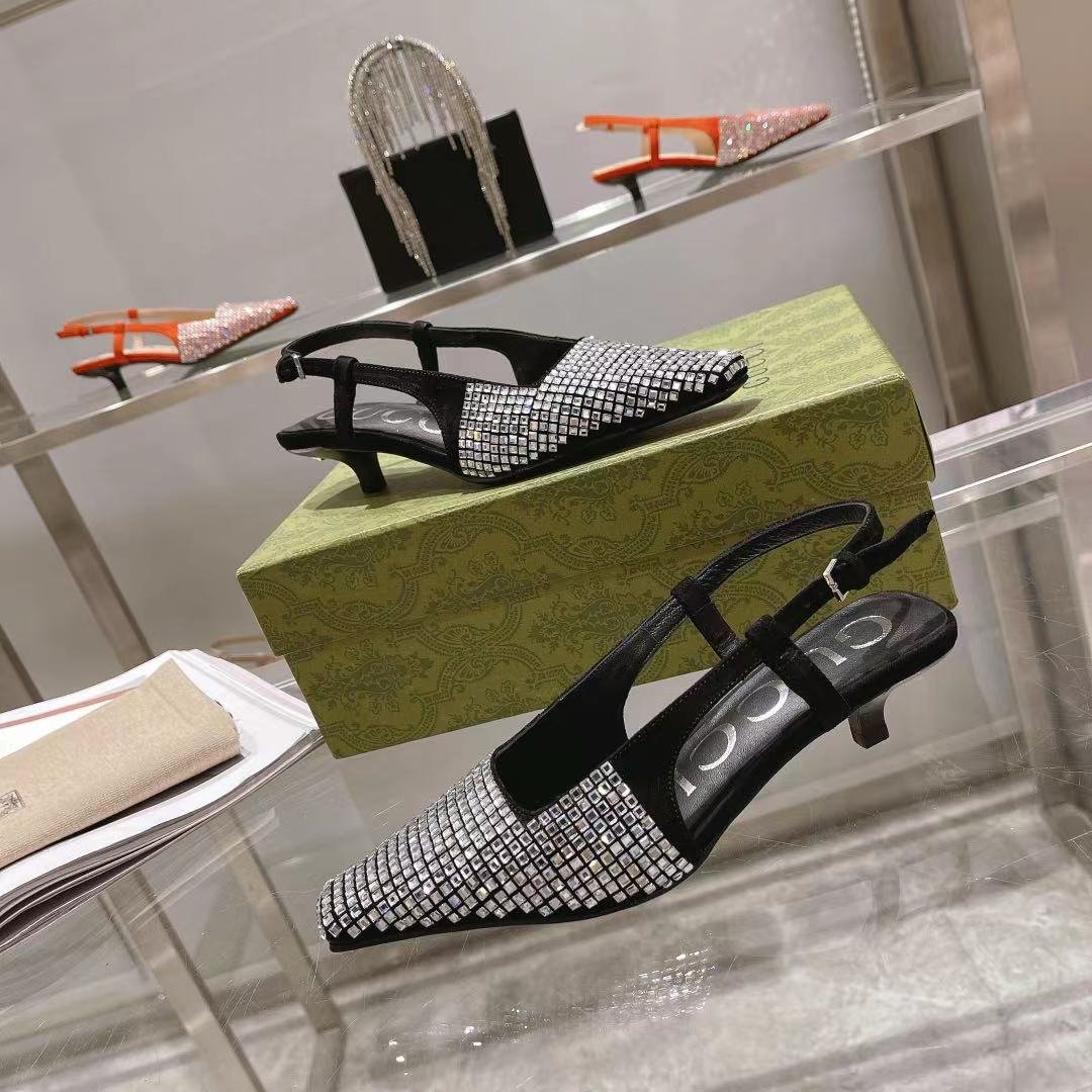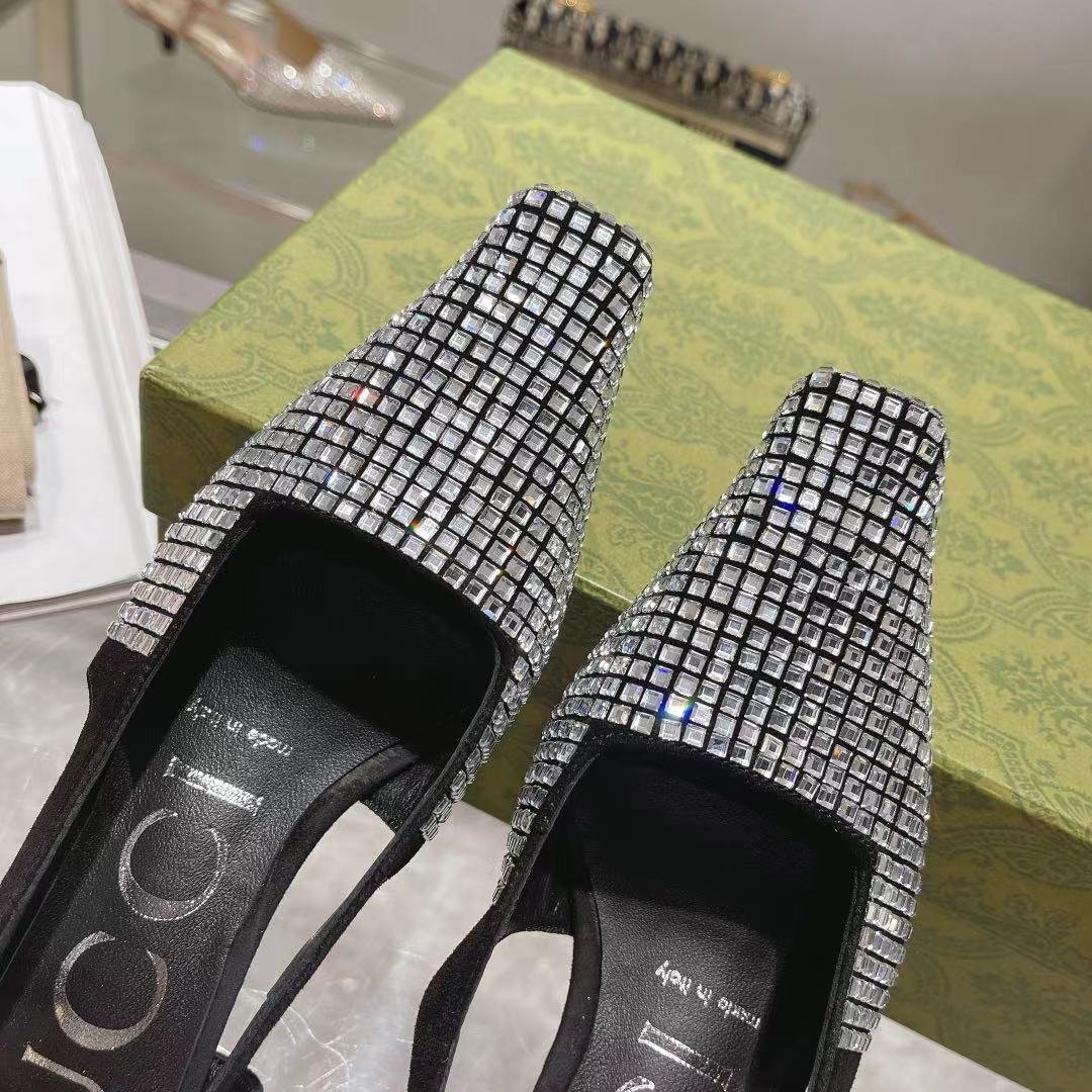 Gucci Aria 系列借鉴了 90 年代和 2000 年代初期的档案,其中的单品灵感来自 Tom Ford 的 Gucci 时代。女性气质的新理念展现了迷人的细节,如蕾丝、水晶和透明面料。这双露跟鞋采用黑色帆布制成,饰有闪亮的 GG 图案。