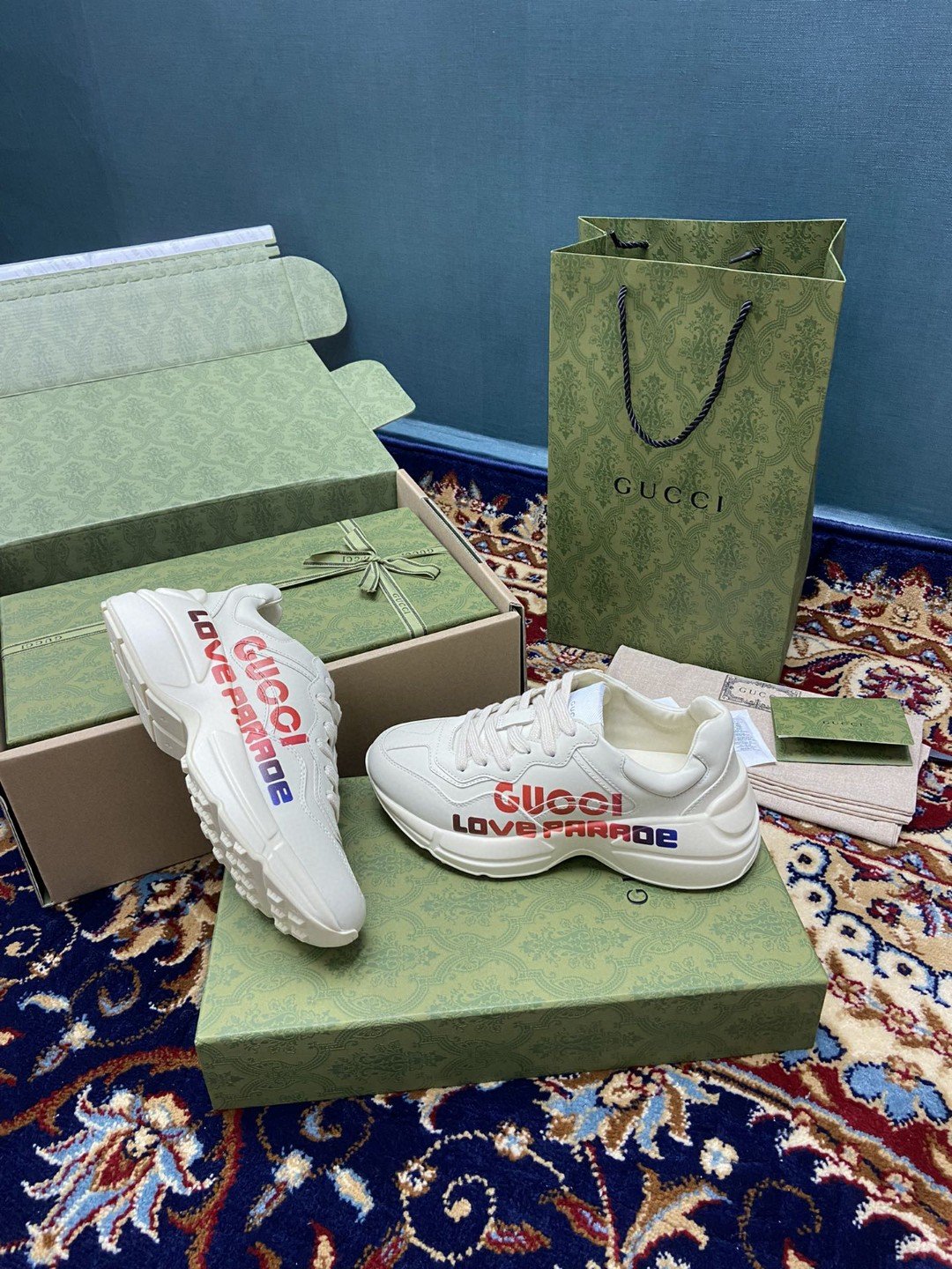 Gucci 女式 Rhyton 运动鞋搭配 Gucci Love Parade 红白象牙色女式 524990