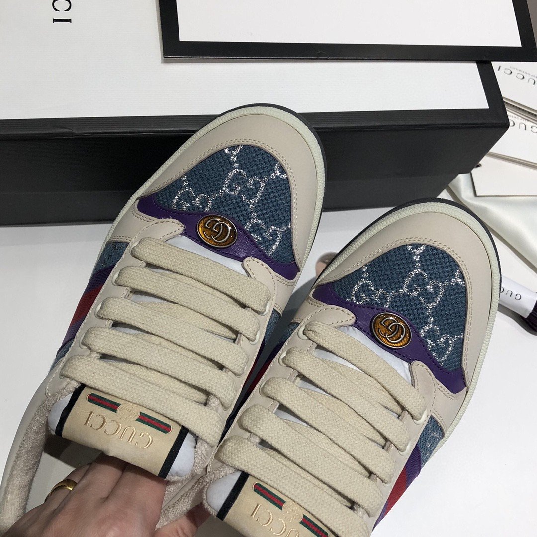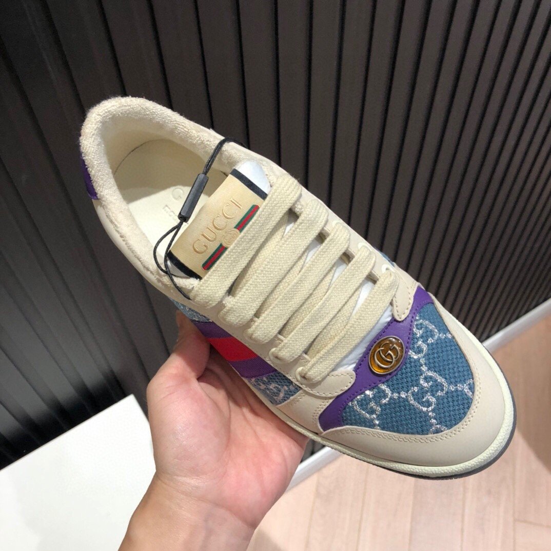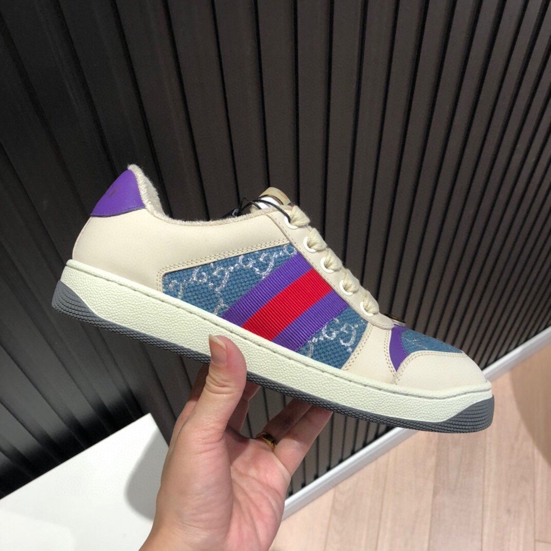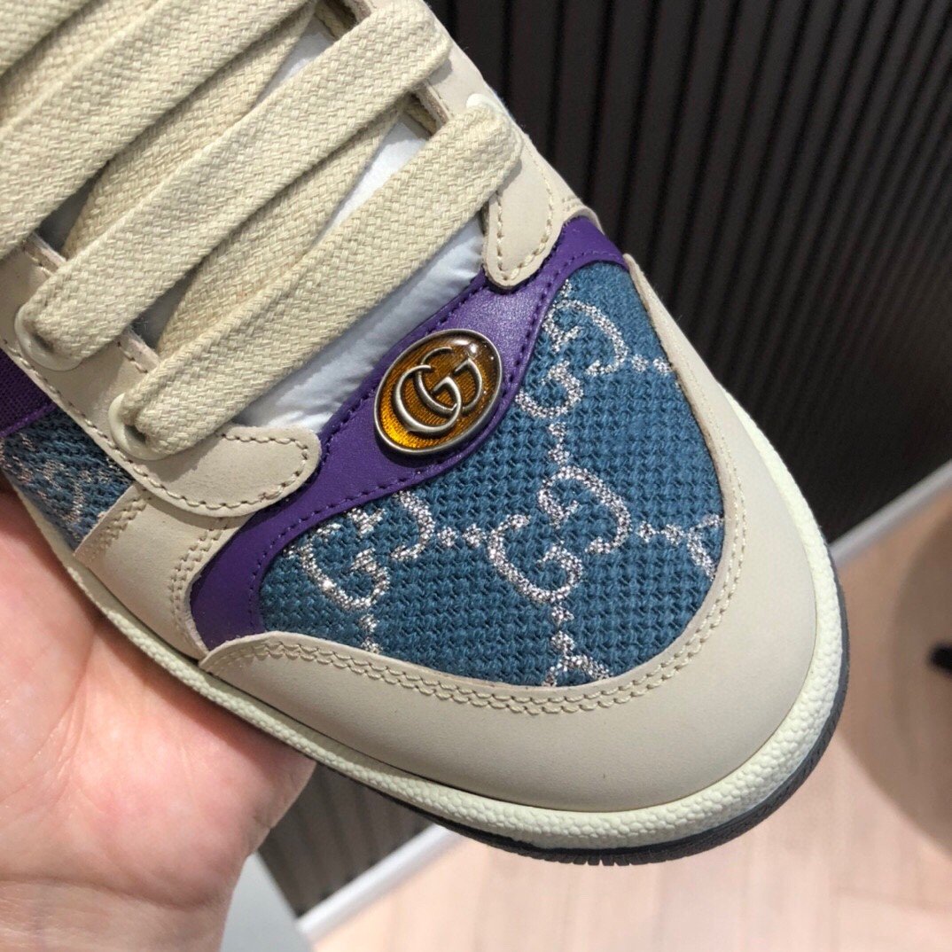 Screener 采用档案风格面料的迭代,采用象牙色和蓝色的混合设计银色浅色 GG lamE。这款运动鞋受到 70 年代经典运动鞋的影响,以防御性运动命名,侧面饰有织带条纹和复古 Gucci 标志。