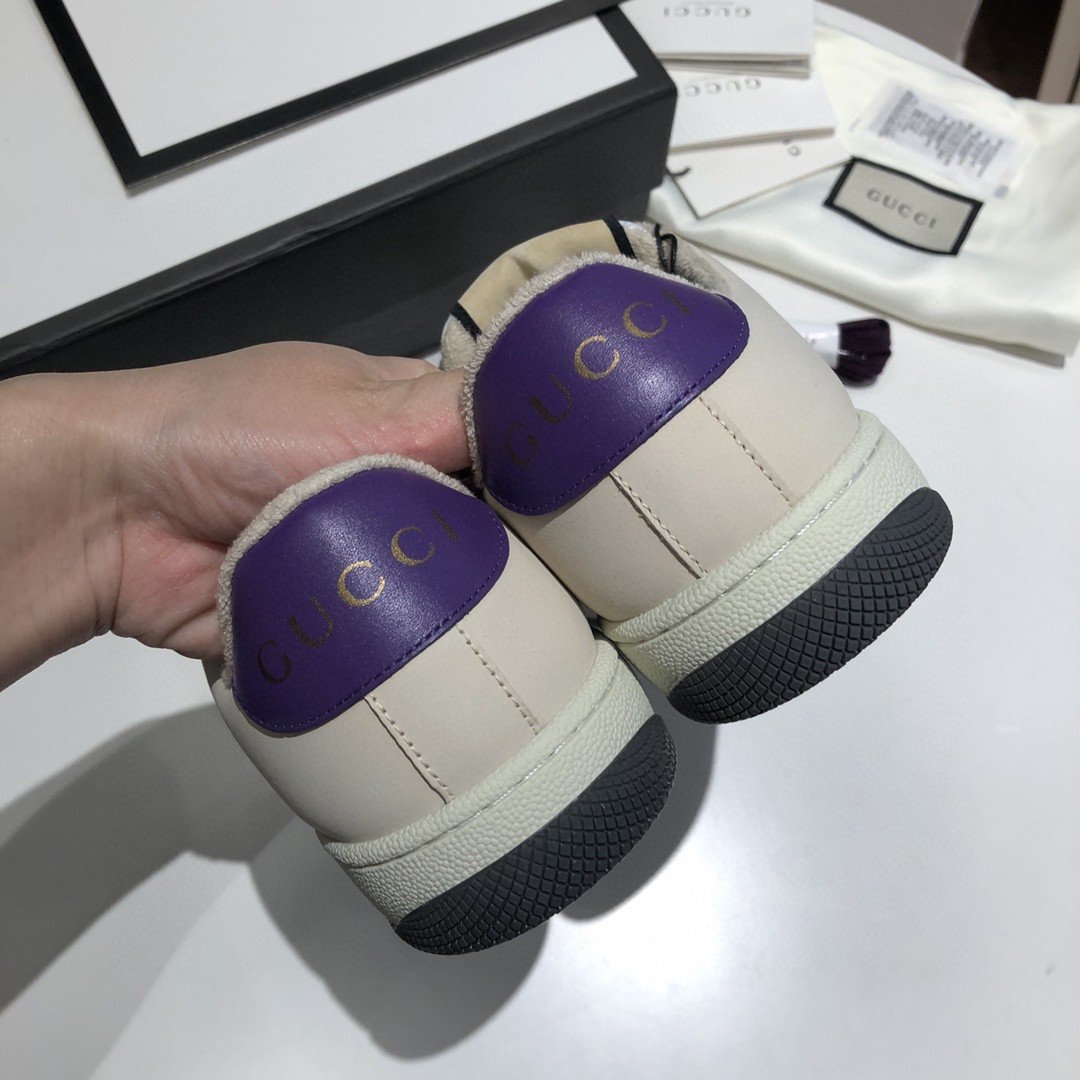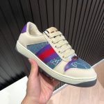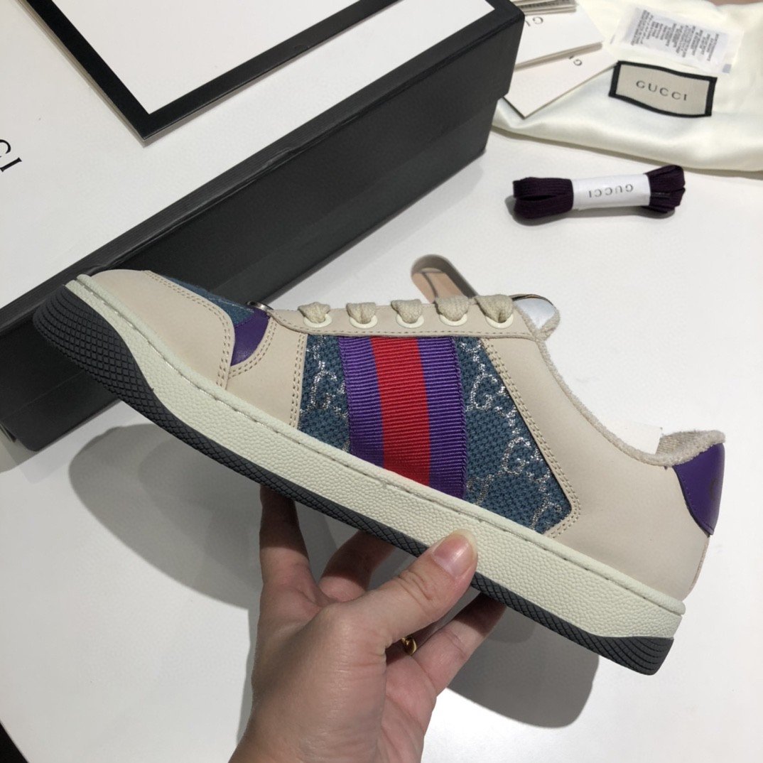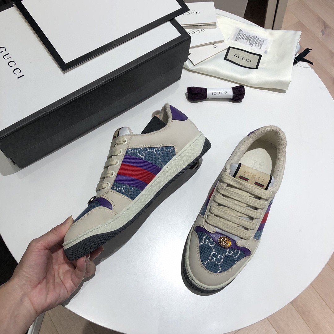 Screener 采用档案风格面料的迭代,采用象牙色和蓝色的混合设计银色浅色 GG lamE。这款运动鞋受到 70 年代经典运动鞋的影响,以防御性运动命名,侧面饰有织带条纹和复古 Gucci 标志。