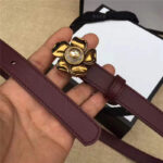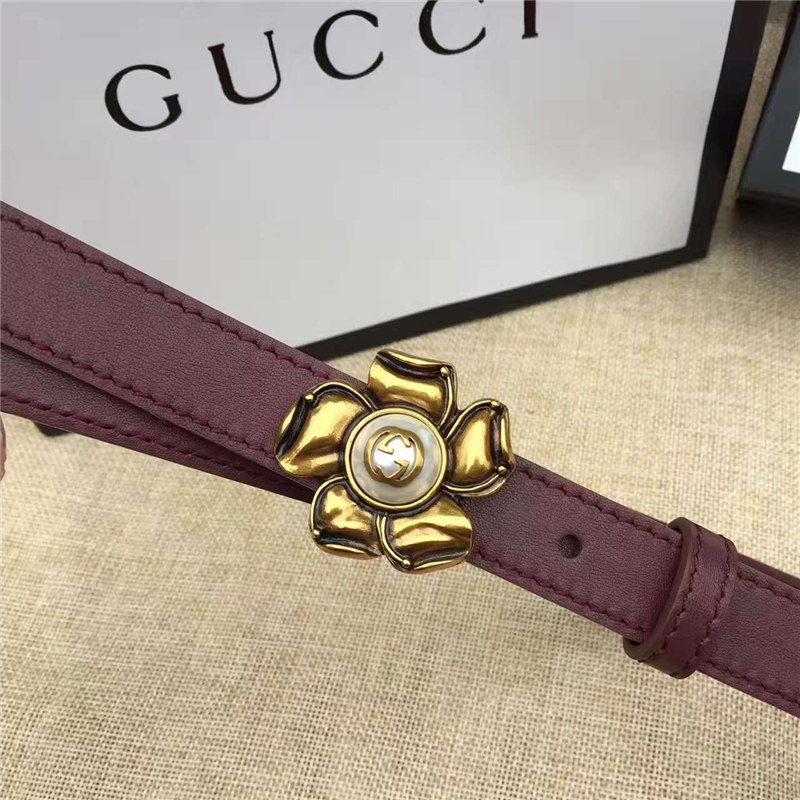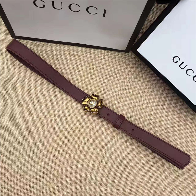 • Gucci 新款 原版牛皮 山茶花中间镶珍珠双G 女士腰带 棕红色