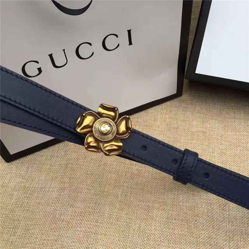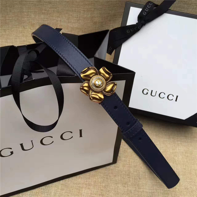 - Gucci 新款 原版牛皮 山茶花中间镶珍珠双G 女士腰带 藏蓝色