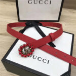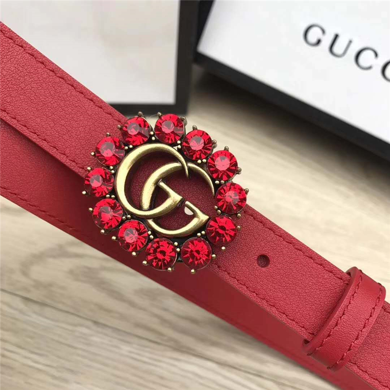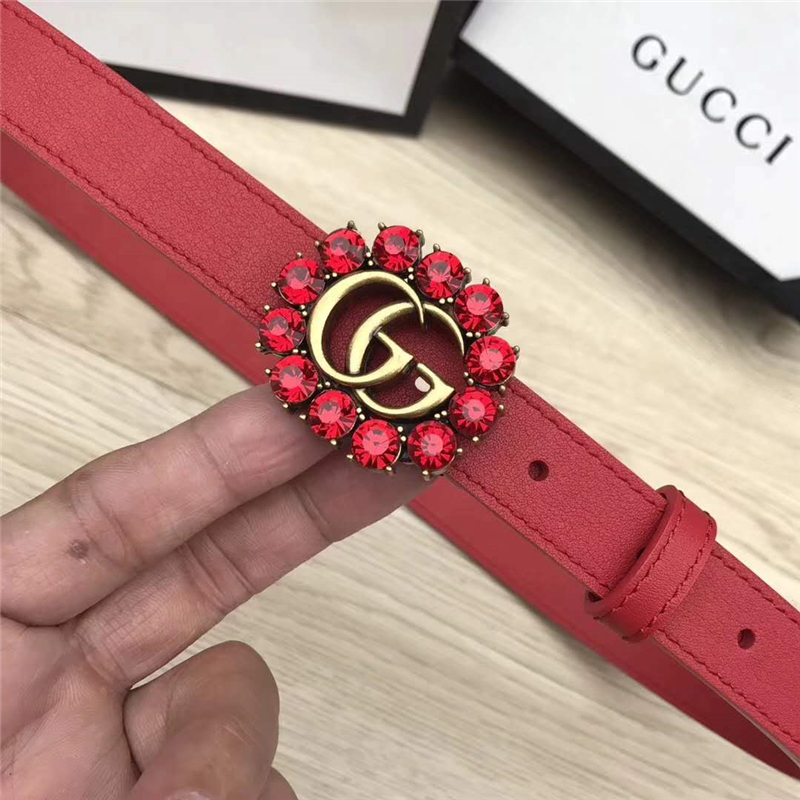 • Gucci 模特走秀款 红色水晶 双G带扣 皮革腰带 大红